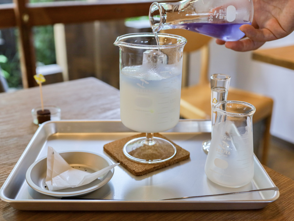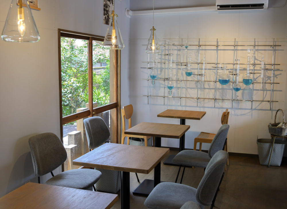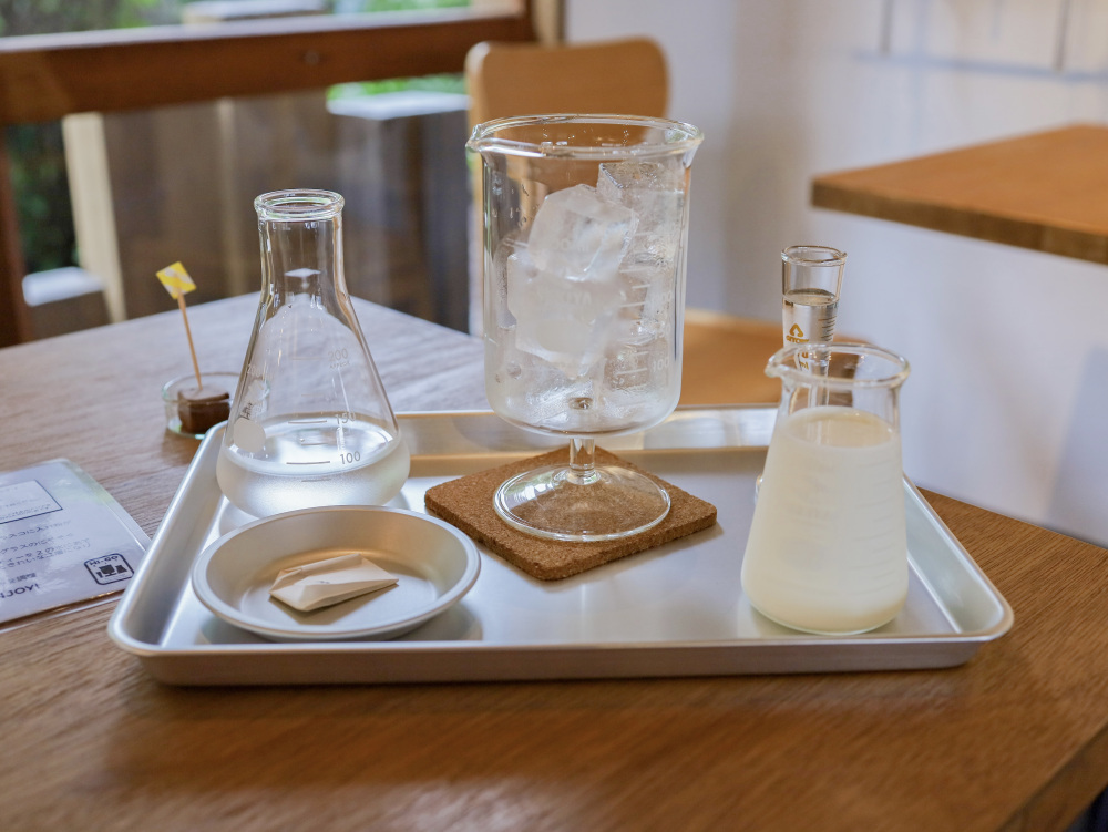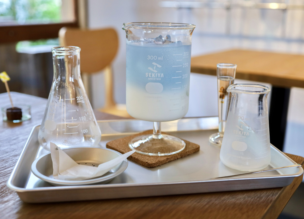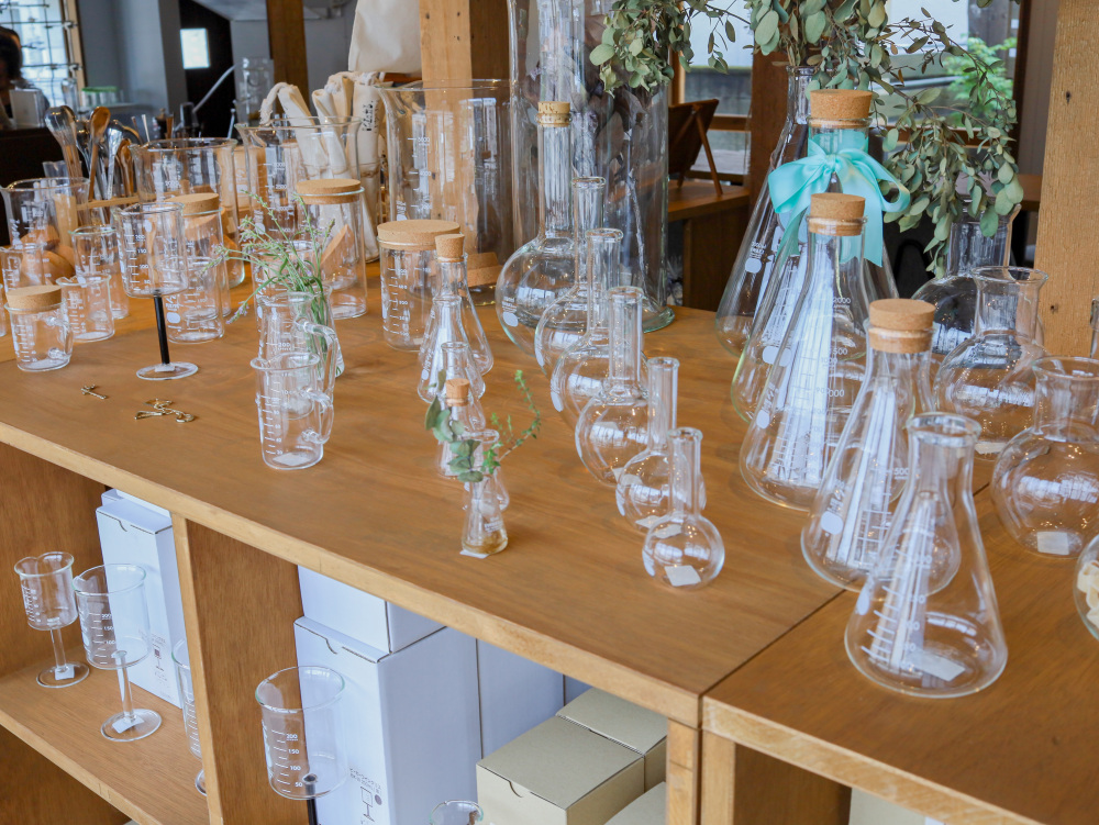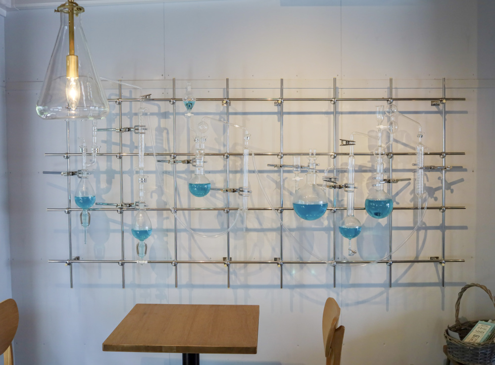 壁面の雰囲気や、たくさん並んでいる理化学ガラスの実験器具(ビーカー、フラスコ、試験管など)まるで理科室そのままの雰囲気に学生時代の懐かしさを感じ、自分が理系女子だったこともあってとてもワクワクしました( ˃◡˂ )