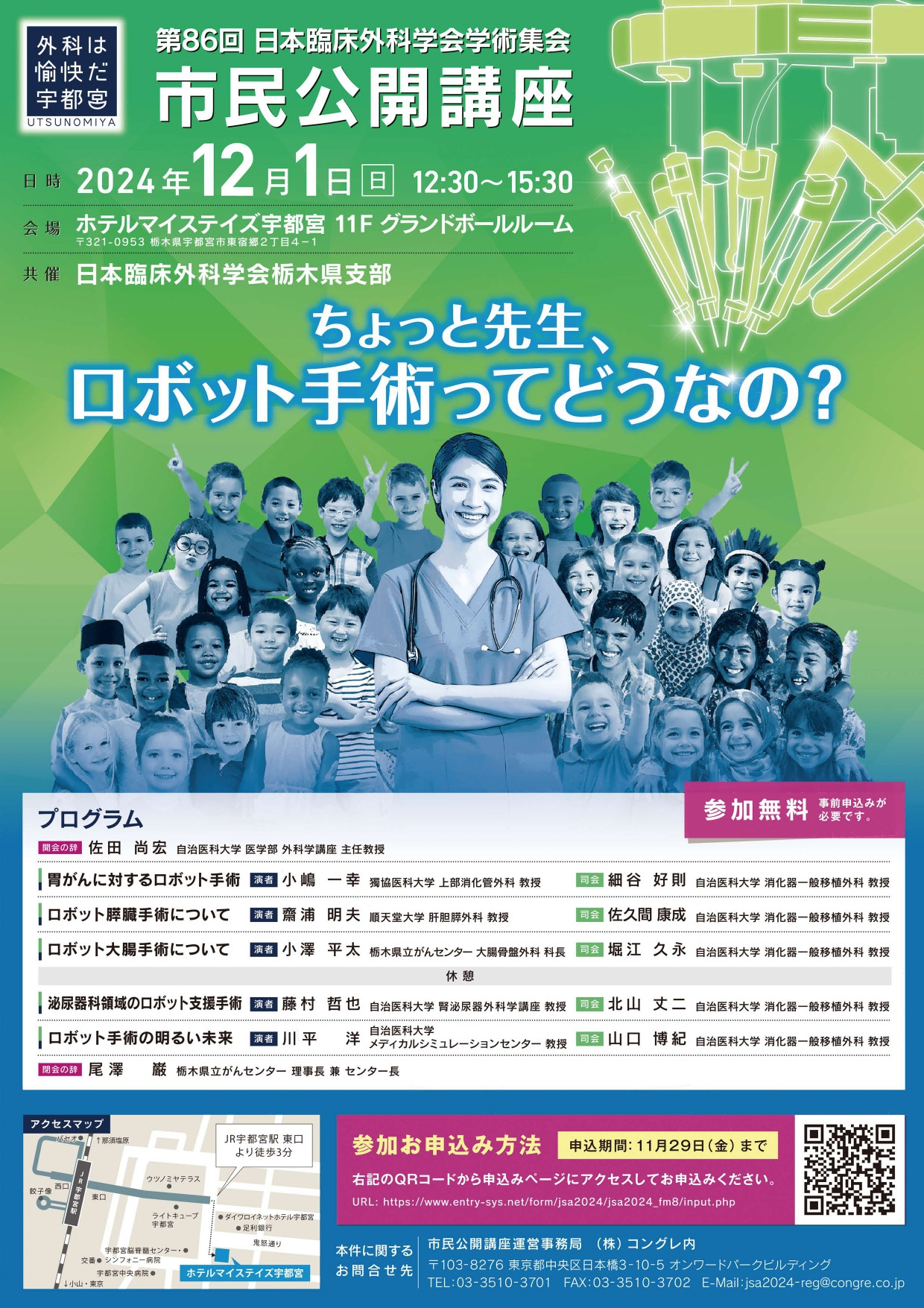 12月1日(日)にホテルマイステイズ宇都宮にて、「第86回日本臨床外科学会学術集会市民講座」が開催されます。参加費無料、基本事前申し込み制となりますので、どうぞご参加ください。