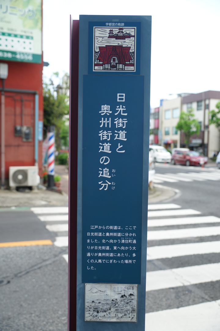 江戸からの街道は、ここで日光街道と奥州街道に分かれました。北へ向かう清住町通りが日光街道、東へ向かう大通りが奥州街道に当たり、多くの人馬で賑わった場所でした。
