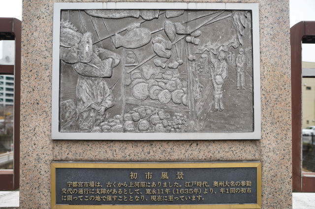 「宇都宮市場は古くから上河原にありました。江戸時代、奥州大名の参勤交代の通行に支障があるとして、1635(寛永11)年より、年1回の初市に限ってこの地で催すこととなり、現在に至っています。」