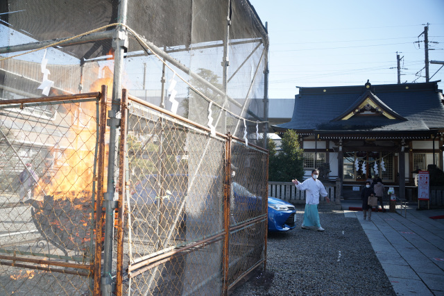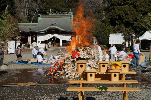 1月14日には「どんと焼き」(お焚き上げ)が行われています。正月の注連縄、古いお札、お守り、神棚、縁起物などを焚き上げていますので、お持ちよりください。お焚き上げの聖なる火にかざした「まゆ玉餅」が授与されるほか、境内には屋台が並び、大きな賑わいとなりますので、是非お出かけください。
