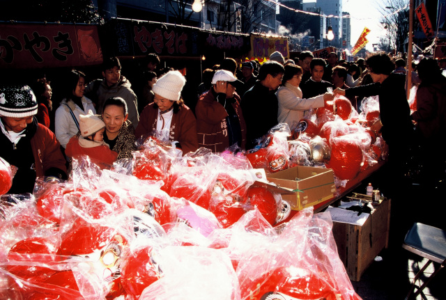 「だるま」、「黄ぶな」、「熊手」は、まさに縁起物の”三種の神器”!毎年複数のお店が出店しています。