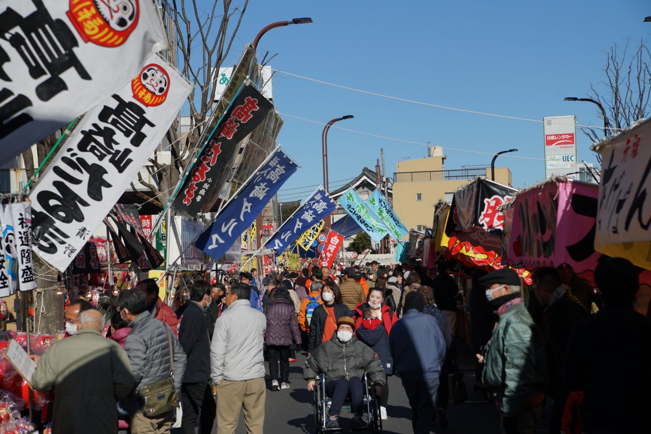 毎年1月11日に行われていて、JR宇都宮駅に近い上河原通りに、約400mに渡って縁起物のだるまや熊手、宇都宮ならではの「黄ぶな」や「豆太鼓」などを売る約300軒の露店が並びます。だるまを売る店には高さ10cmから70cmを超えるものまで大小のだるまが並び、店では大型のだるまが売れると、拍子木や太鼓を打ち鳴らしながら威勢よく手締めをして景気をつけています。