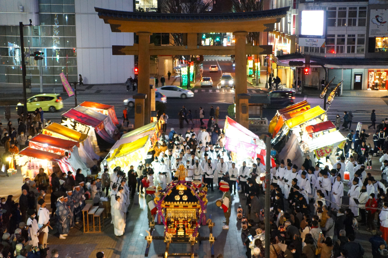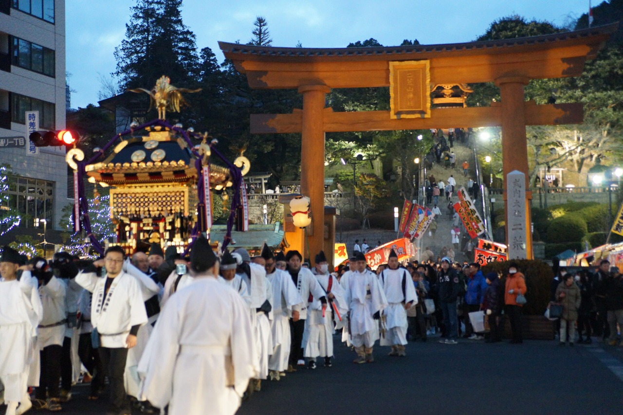 宇都宮市民に一年の終わりと正月の終わりを告げる二荒山神社の夜祭です。二荒山神社のご神体を下の宮がある荒尾崎から臼が峰(現在の社殿場所)に還座したことが祭礼の始まりと伝えられ、古くは838年まで遡ります。一般に神社の還座の儀式は夜中に行われるものであり、二荒山神社でも夜中に行われたことから、これを渡り夜と呼ぶようになり、後にこれが訛って「おたりや」と呼ばれるようになったと伝えられています。後に、神恩感謝、江戸初期からは火難を免れたご利益から火防の祭としても知られるようになりました。