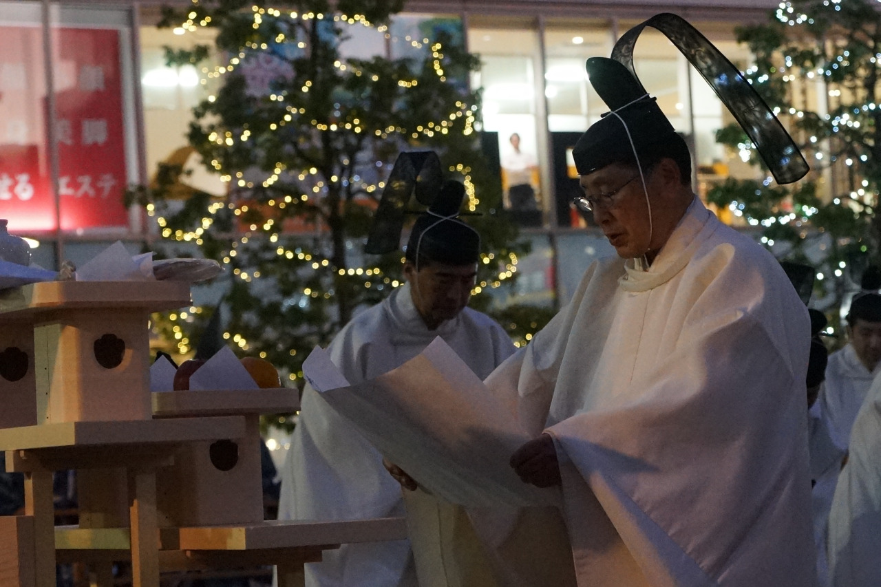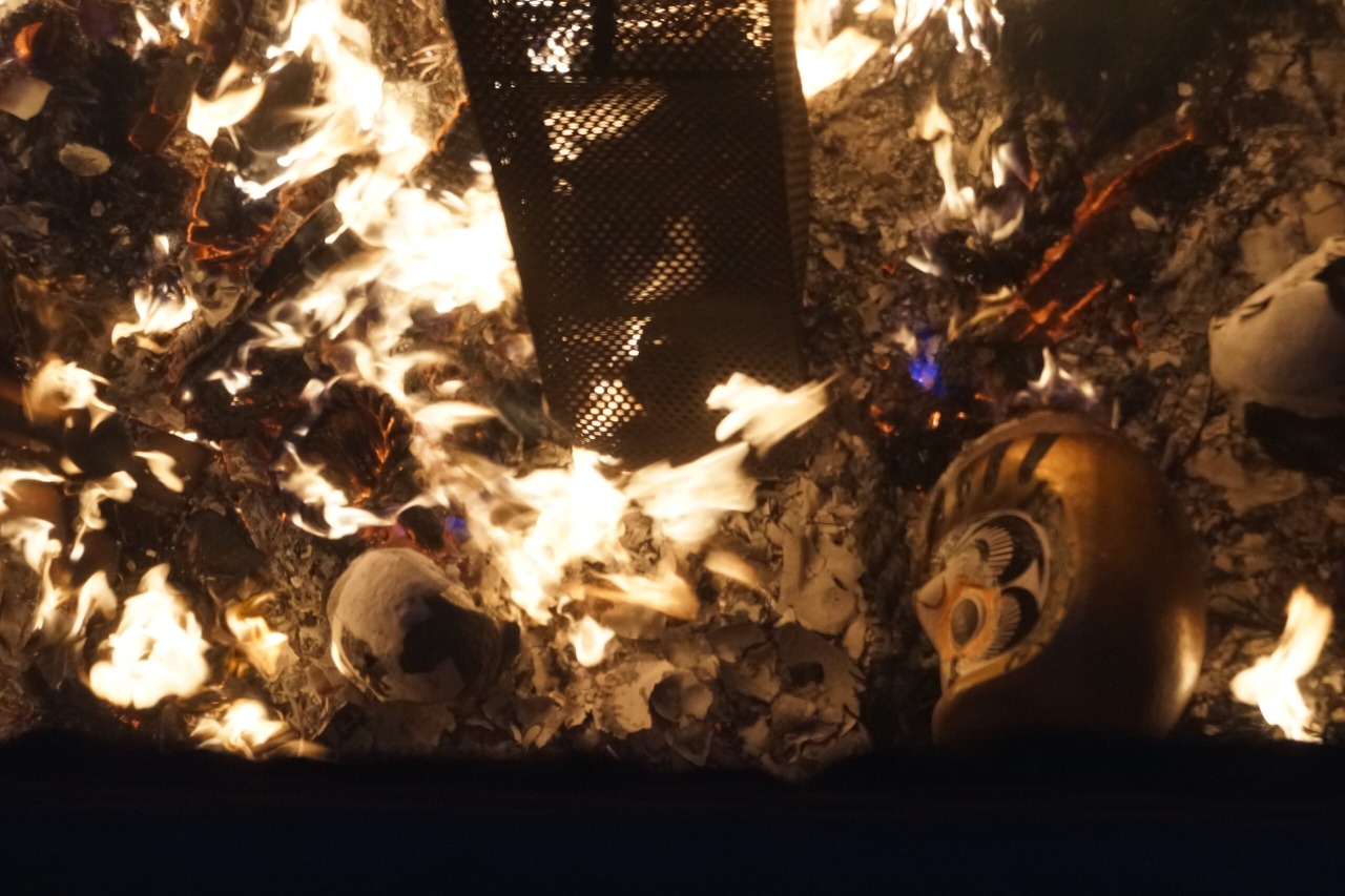 二荒山神社の社殿東側に設けられた焚き上げ所では「お焚きあげ」が行われ、12月には古いお札やダルマなどの縁起ものを、1月には正月飾りを焚き上げます。この煙を頭にあてると、家内安全や無病息災、火災防止などのご利益があると伝えられ、市内を始め近郷近在から多くの人々が夜遅くまで参拝に訪れています。