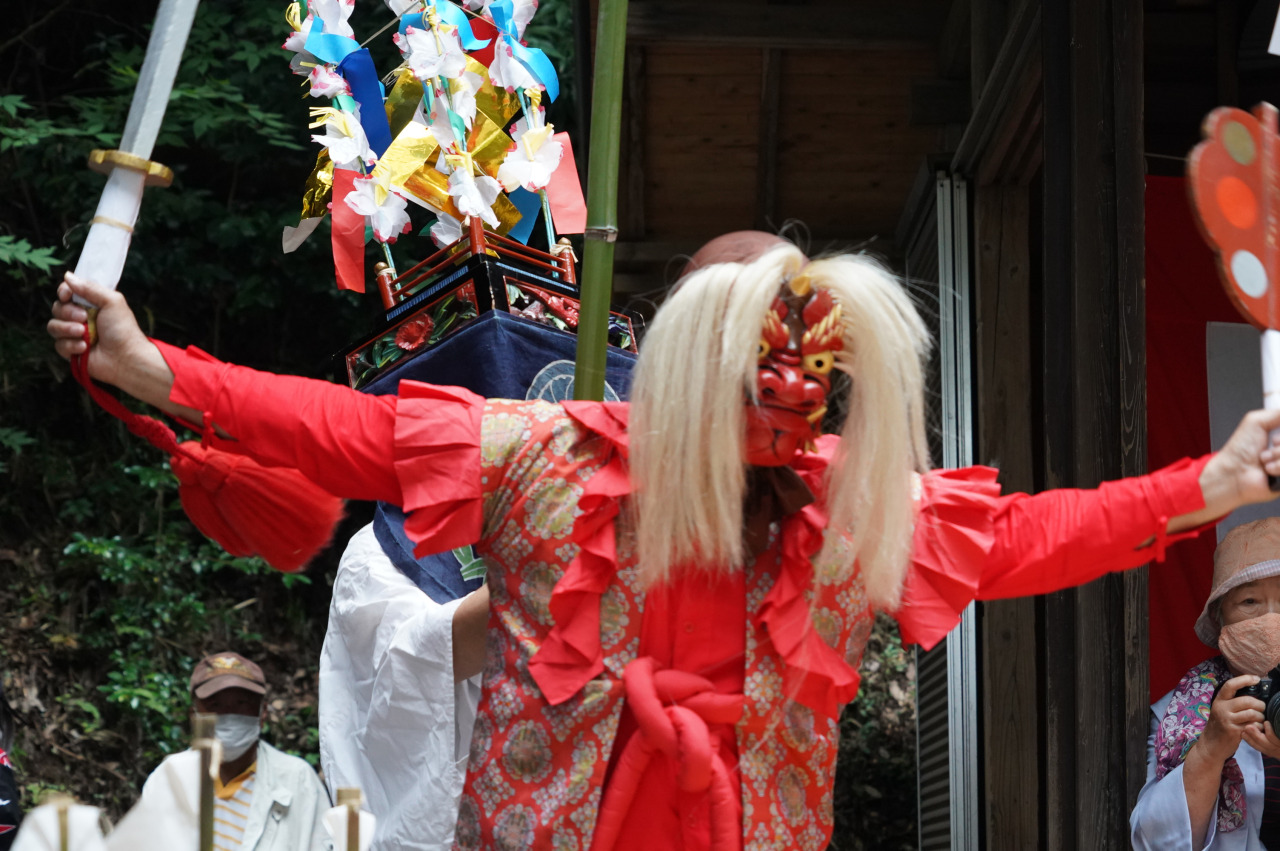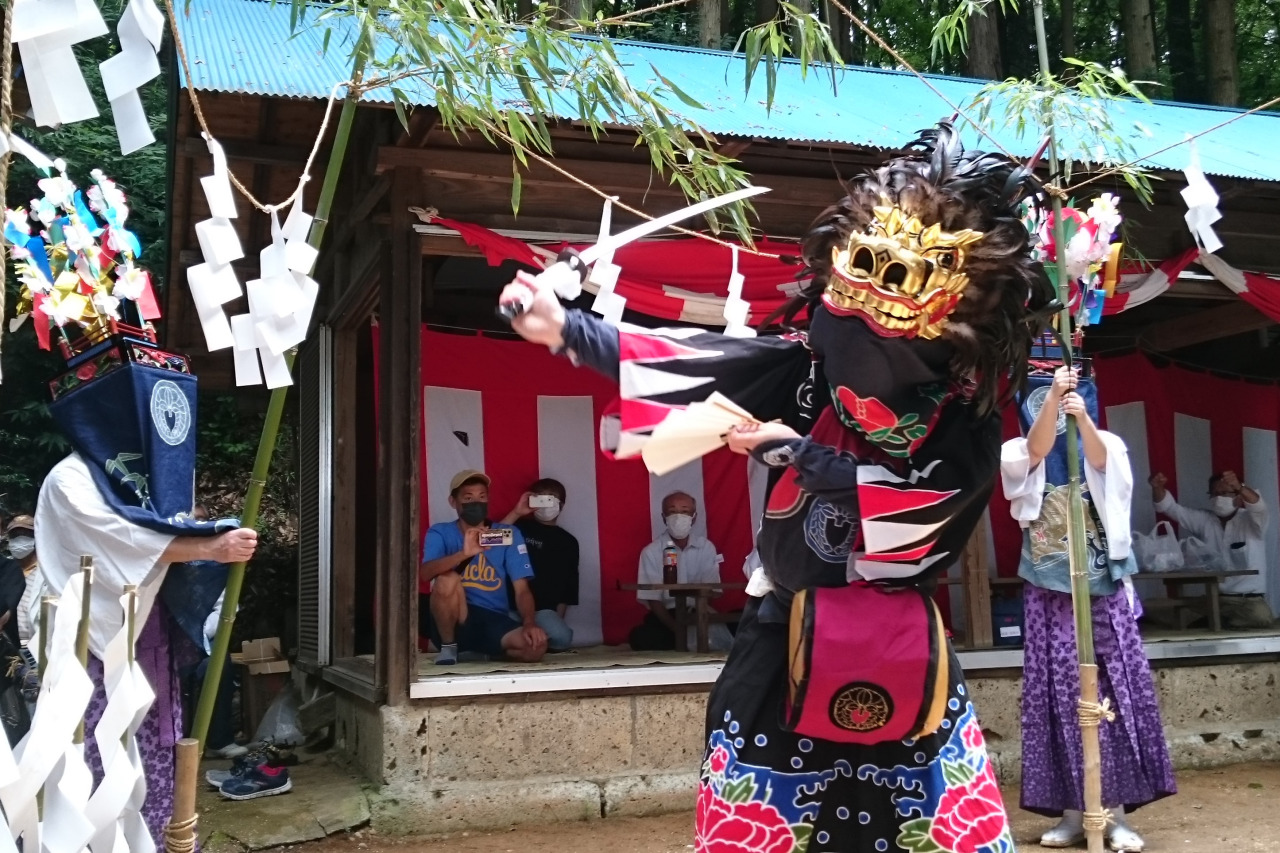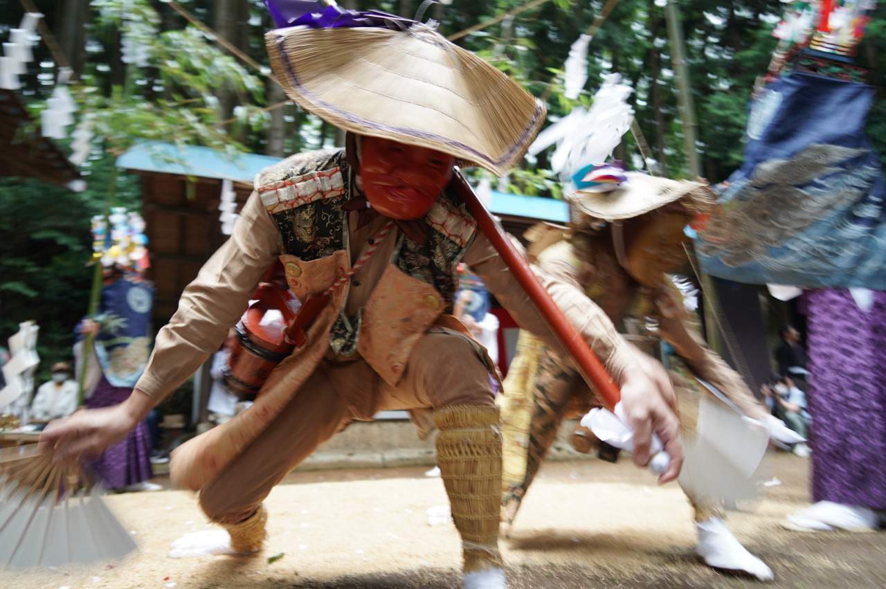 県指定文化財で、県下に広く分布する関白流獅子舞の始祖とされ、今日まで一千年も脈々と引き継がれてきた獅子舞。上河内地区の関白山神社の祭礼で毎年8月第1土曜日に、悪魔払い、家内安全、厄難消除として行われる獅子舞です。この獅子舞は、平安時代に都から賊退治を任じられた藤原利仁公が、この地で急逝し、その葬儀の折り、一天にわかにかき曇り、辺り一面闇夜のようになったので、3匹の獅子を舞わせたところ天候が戻ったという伝説が由来とされています。祭礼当日は、朝公民館で身支度を整え、9時ごろ26人程の行列を組み、神参りの笛と太鼓で神社へと進みます。神社では神事の後、午後4時ごろまで、平庭(ひらにわ)、蒔寄(まきよせ)、唐土(とうど)の舞、弓くぐり、芝隠し、御子舞(みこまい) の六庭を演じます。最後の舞「御子舞」は関白流獅子舞の開起を模倣したもので、賊を鬼に、利仁公と家臣が獅子となって鬼を退治するストーリーとなっています。
