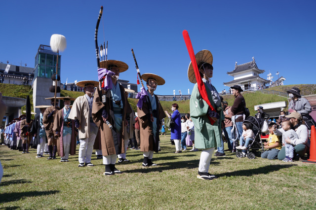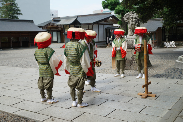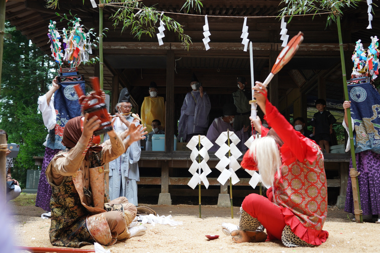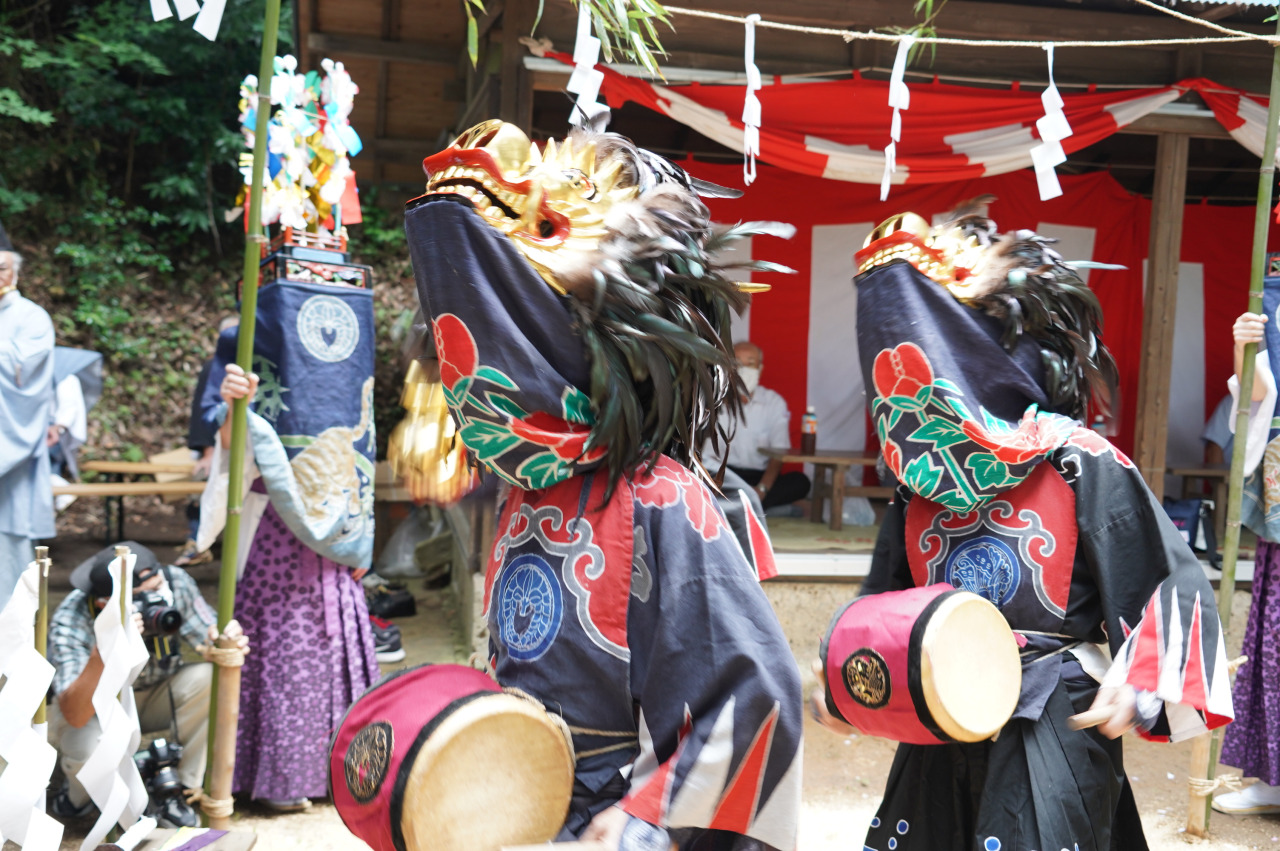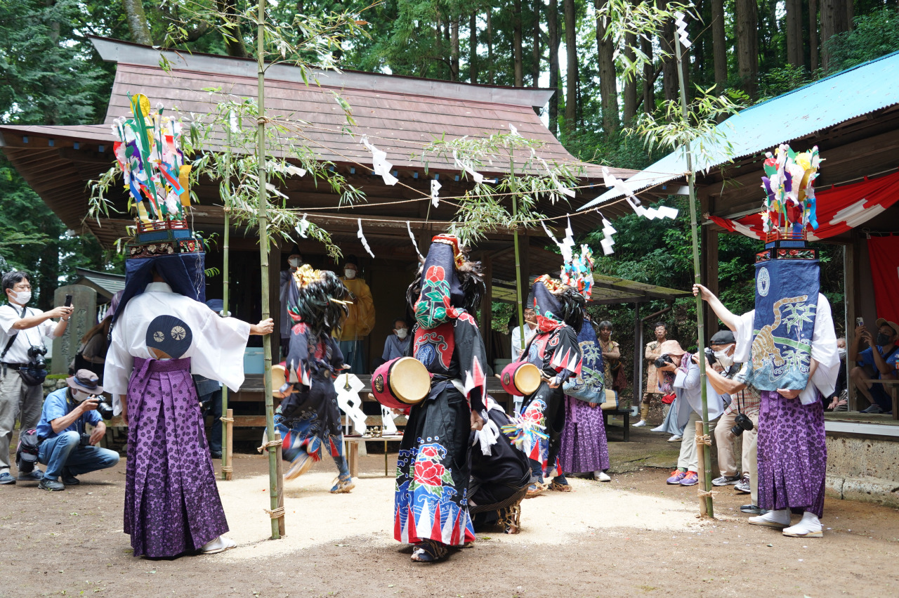 県指定文化財で、県下に広く分布する関白流獅子舞の始祖とされ、今日まで一千年も脈々と引き継がれてきた獅子舞。上河内地区の関白山神社の祭礼で毎年8月第1土曜日に、悪魔払い、家内安全、厄難消除として行われる獅子舞です。この獅子舞は、平安時代に都から賊退治を任じられた藤原利仁公が、この地で急逝し、その葬儀の折り、一天にわかにかき曇り、辺り一面闇夜のようになったので、3匹の獅子を舞わせたところ天候が戻ったという伝説が由来とされています。祭礼当日は、朝公民館で身支度を整え、9時ごろ26人程の行列を組み、神参りの笛と太鼓で神社へと進みます。神社では神事の後、午後4時ごろまで、平庭(ひらにわ)、蒔寄(まきよせ)、唐土(とうど)の舞、弓くぐり、芝隠し、御子舞(みこまい) の六庭を演じます。最後の舞「御子舞」は関白流獅子舞の開起を模倣したもので、賊を鬼に、利仁公と家臣が獅子となって鬼を退治するストーリーとなっています。