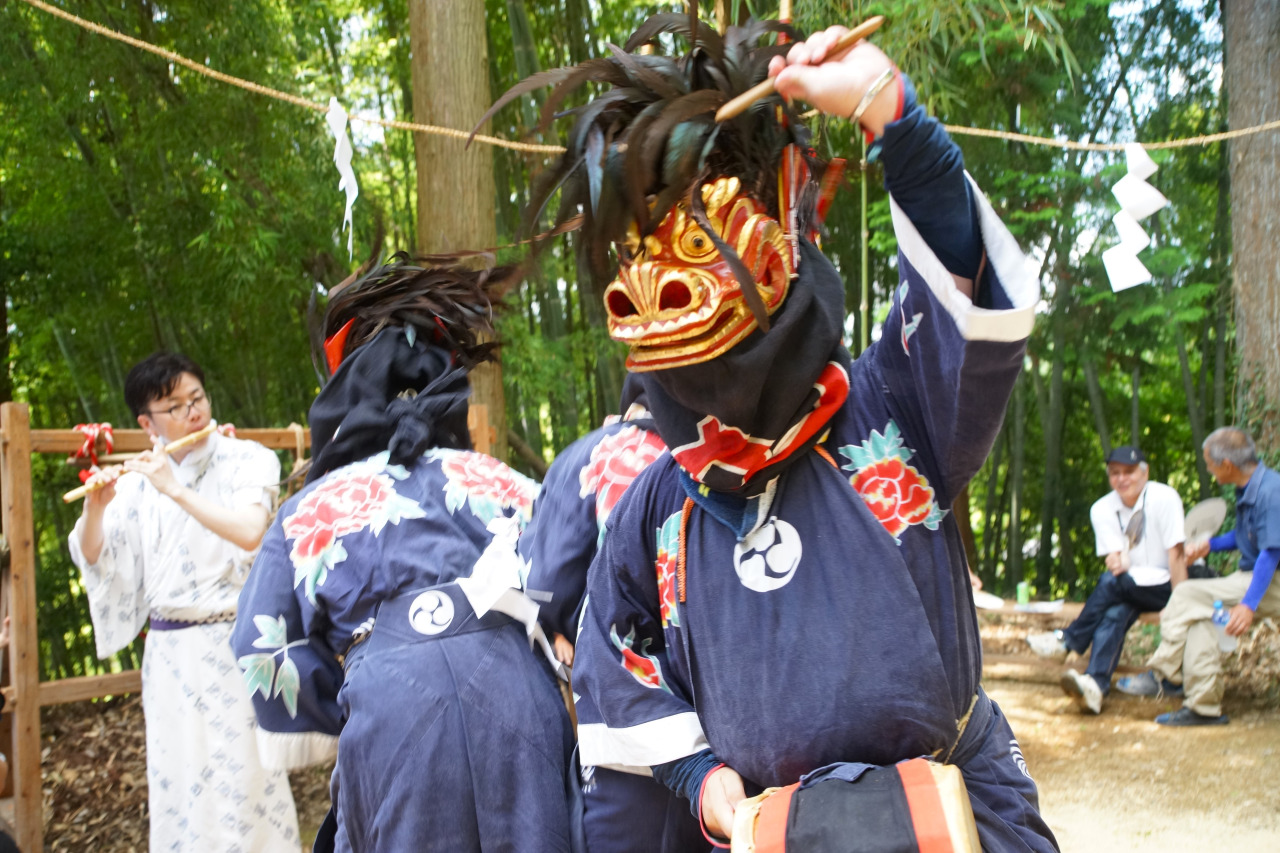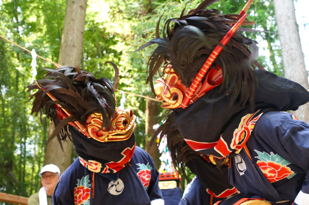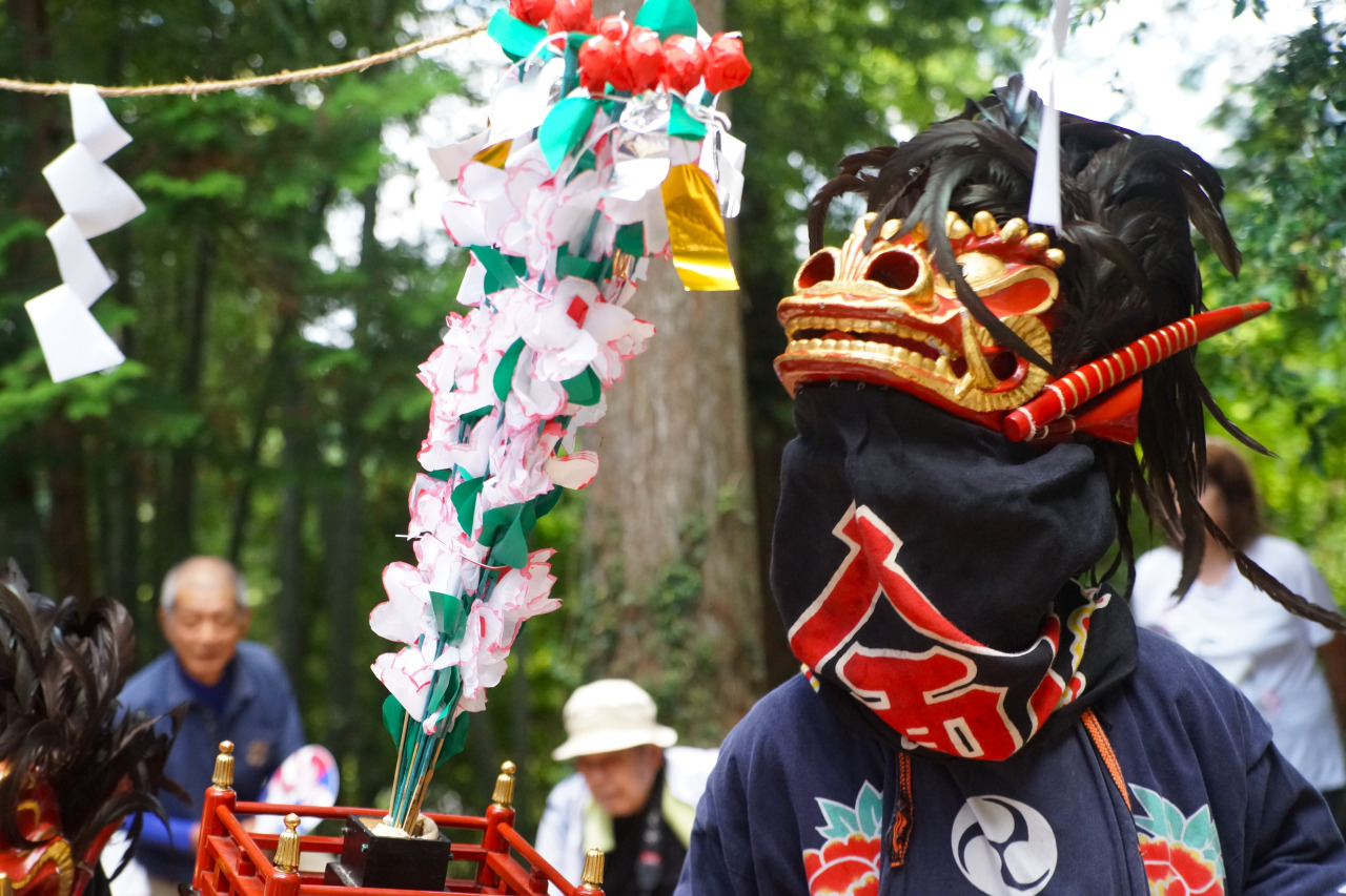 逆面町に中世より伝わる獅子舞で、白山神社の境内で五穀豊穣、子孫繁栄、家内安全を願って奉納され獅子舞です。この逆面の獅子舞は関東地方特有の風流系の一人立ち三匹獅子舞の代表格の獅子舞で、舞の踊り形や姿は関東で2番目と自負しています。獅子舞の日は村中の人が日の出と共に神社に登り、獅子を奉納した後に正午前から夕方まで獅子舞を奉納します。逆面獅子舞の歴史も古く、室町時代初期の1384年~1392年にこの辺り一体がチフスに襲われたときに、この獅子舞を舞って悪霊の退散を願ったところ、チフスはたちどころに胡散霧消したといわれています。以来、逆面の獅子舞は、村寺、高徳(こうとく)寺に在って、逆面人の魂として、地域の守り神として、毎年に村中を清め流し舞われてきたが、明治の廃仏毀釈令により明治15年ごろからは現在の形になりました。