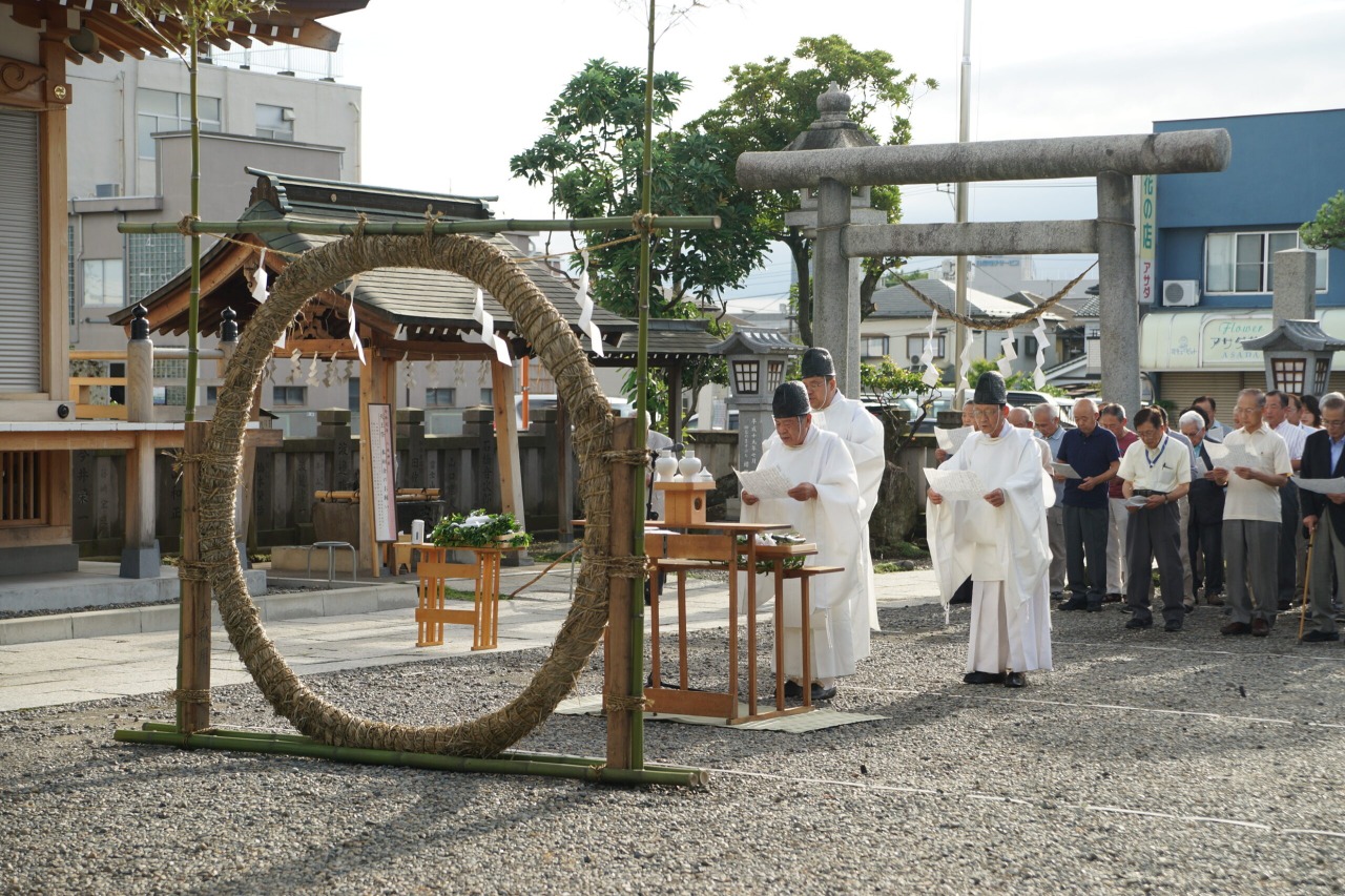 大祓式は人々の罪と穢れを祓い清めるために行われる行事で、今泉八坂神社では毎年6月30日と12月31日の2回行われています。6月の大祓の時には「茅の輪くぐり」という珍しい神事が行われ、6月の大祓は夏越大祓(なごしのおおはらえ)、12月の大祓は年越大祓(としこしのおおはらえ)と呼ばれています。
