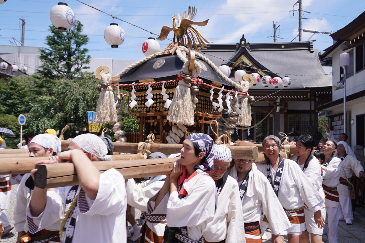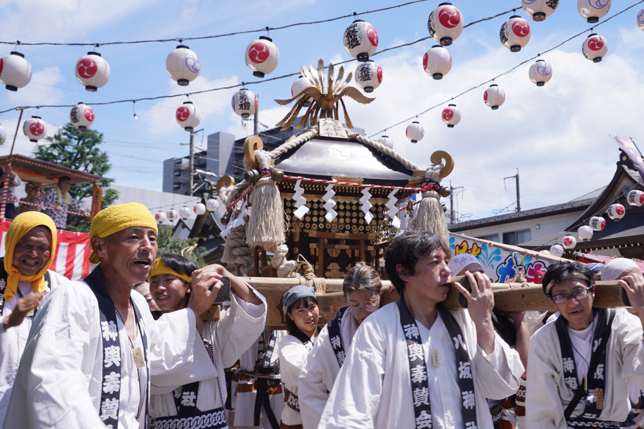 その後は有名な京都の八坂神社の祇園祭より全国に広まり、各地で祇園祭、天王祭、須賀祭と称され行われています。今泉八坂神社では、7月15日~19日が天王祭の期間となり、神社前に17:00~21:00頃飲食屋台が出店され、期間中の日曜日にJR宇都宮駅北側周辺の氏子町会を13:00~19:00頃に神輿が練り歩きます。