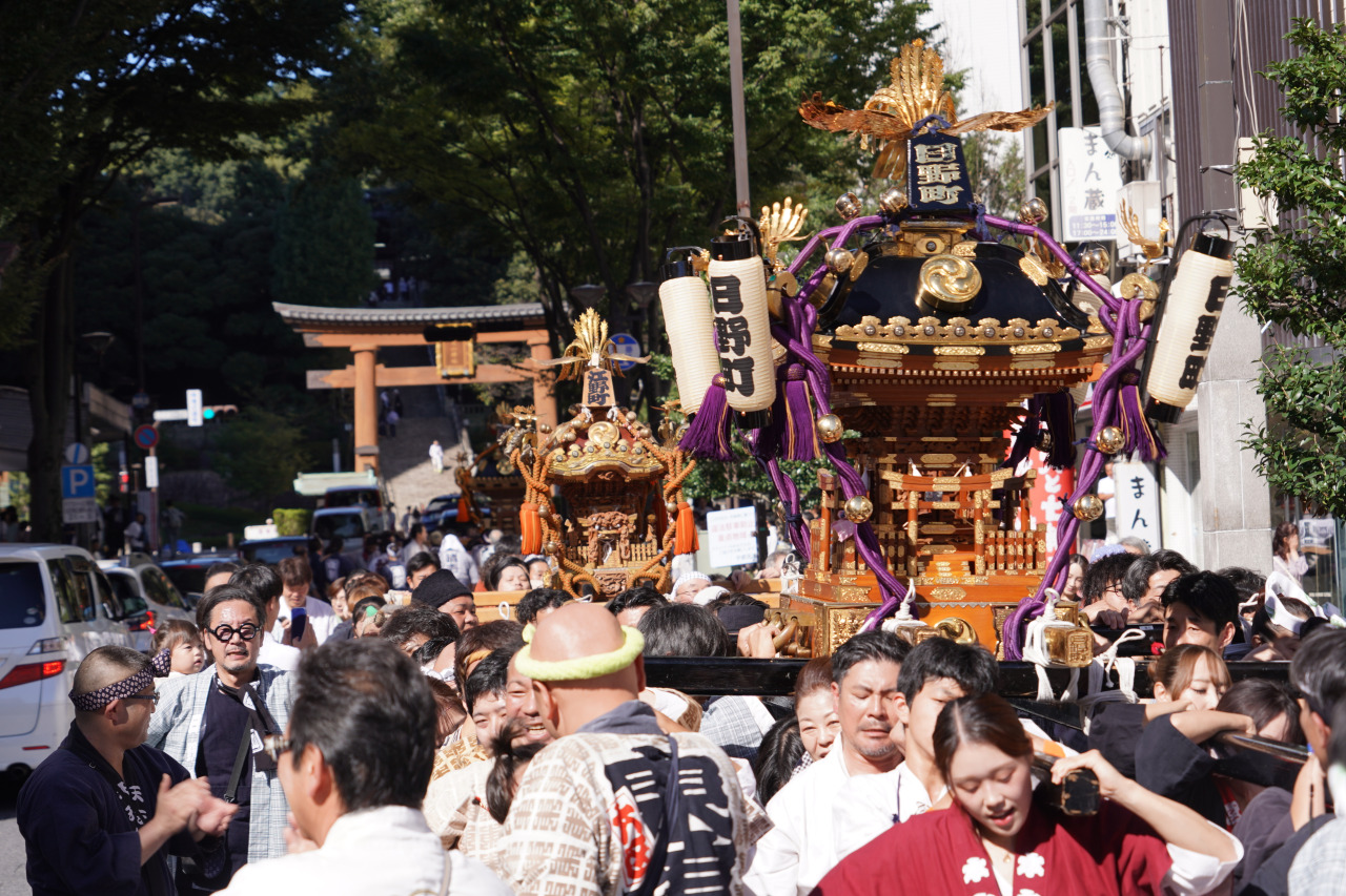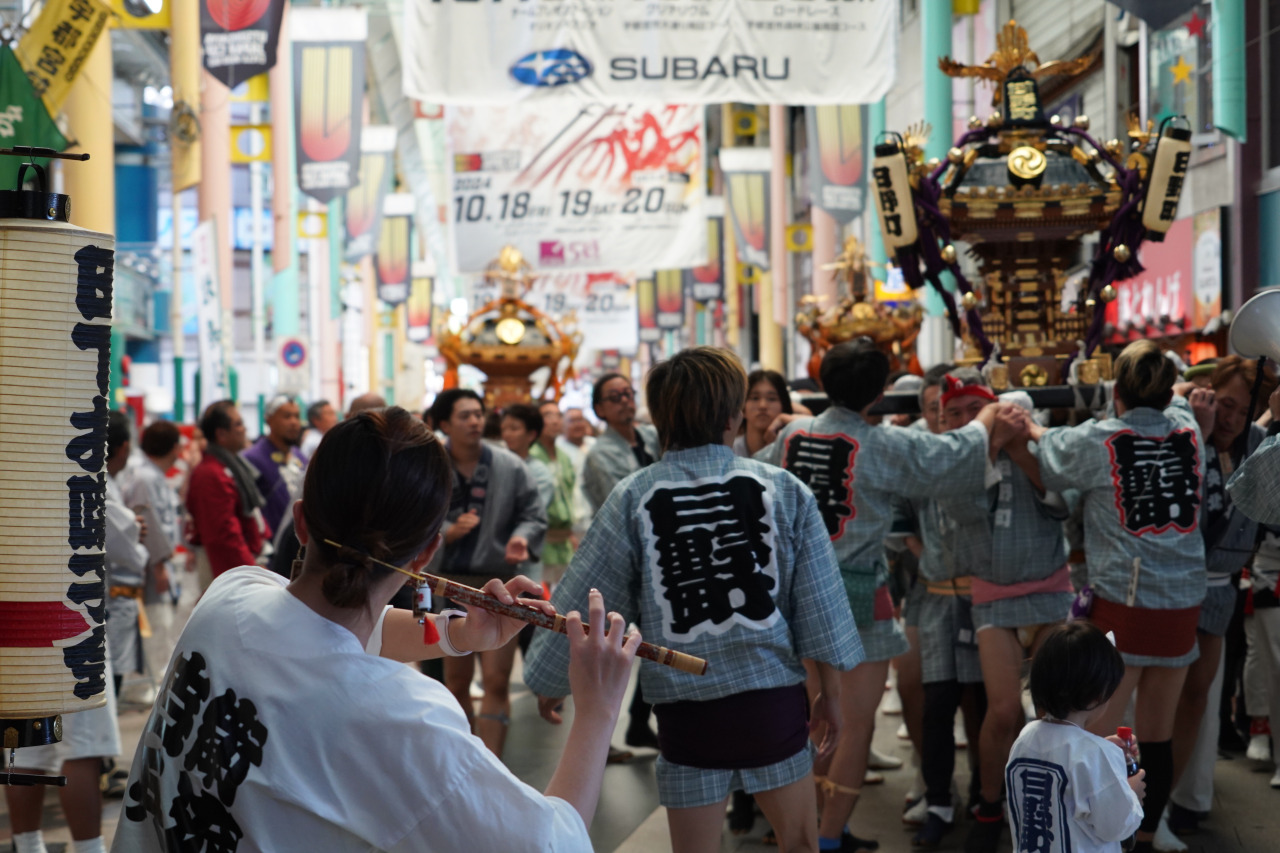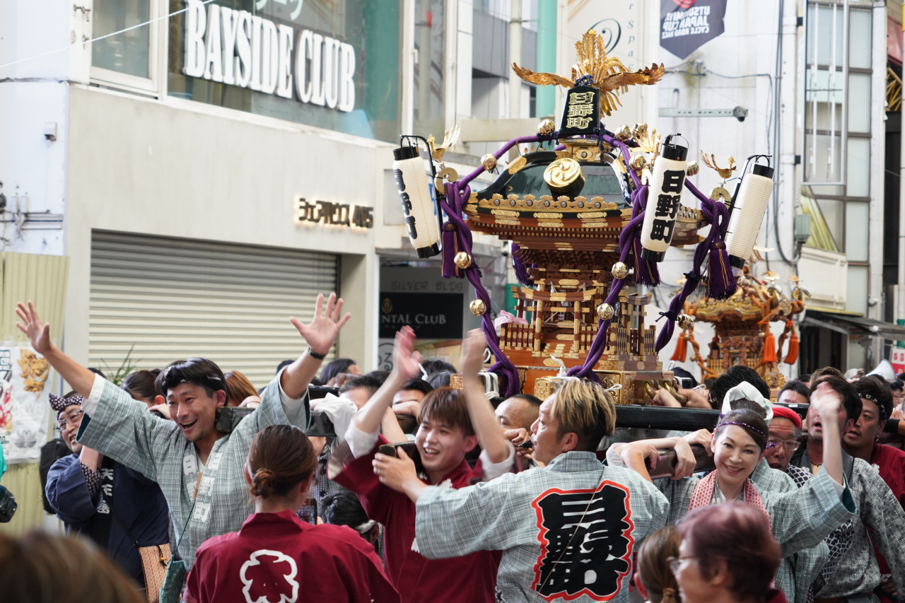中心市街地を盛り上げようと江野町自治会、日野町自治会、市場の神輿が街中を渡御する秋の風物詩です。二荒山神社参道のバンバ広場をスタートし、バンバ通り、オリオン通りを掛け声とともに練り歩きます。