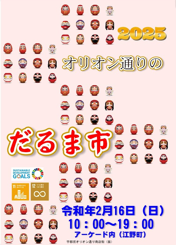 2021年に初めて開催されたオリオン通りのだるま市が今年も開催されます。「だるま」や「きぶな」、「熊手」など縁起物のほか、屋台も出店します。市内では今春最後のだるま市となりますので、是非お出かけ下さい。