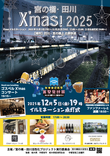 宇都宮市玄関口のシンボルでもある、田川の魅力を再発見し、宇都宮をより活性化していきたい!そんな想いのもと、点灯式イベントでは、宇都宮市内にあるヒノエワイナリーのワインや、フロマージュリーフィルのチーズなどの飲食提供他、宇都宮短期大学音楽科学生による演奏、 Brand-new Somethingによるゴスペルコンサートなど、ワクワクする内容が多数♪