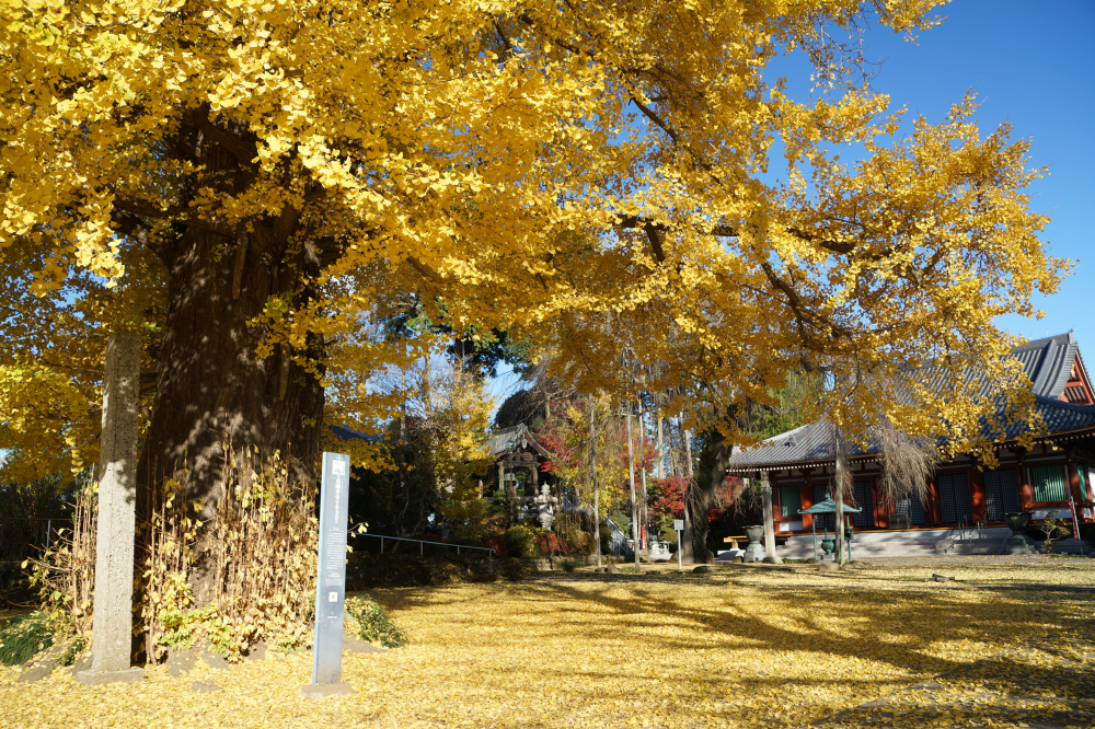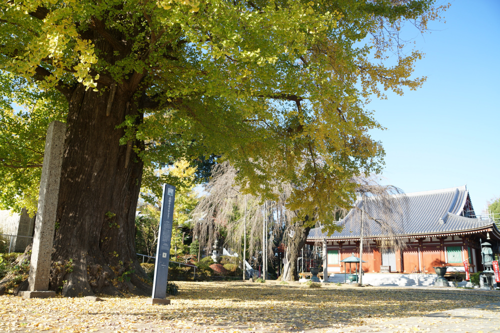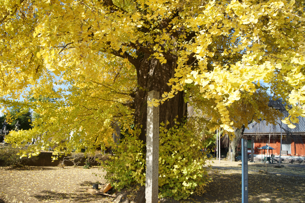 樹高30mに及ぶ巨木で、老木でもあるため乳という大きな気根がたくさん垂れ下がっています。鎌倉時代の武士・安達藤九郎盛長が植えたという伝説も残り、市の天然記念物に指定されています。例年の見頃は11月中旬頃です。