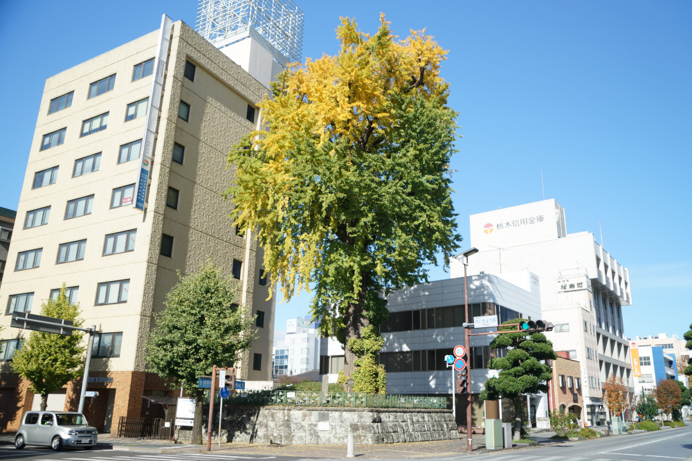 樹木の年齢である樹齢は400年以上と推測され、宇都宮城があった頃から存在していたようです。第二次世界大戦のときには空襲で黒こげになりましたが、次の年には芽吹いたと伝わり、宇都宮のシンボルになっています。この大いちょうは、市の天然記念物にも指定されています。宇都宮市民に愛着・親しみ・誇を感じさせる魅力的な風景として、「うつのみや百景」や「まちなみ景観賞」にも選ばれています。例年の見頃は11月中旬頃です。