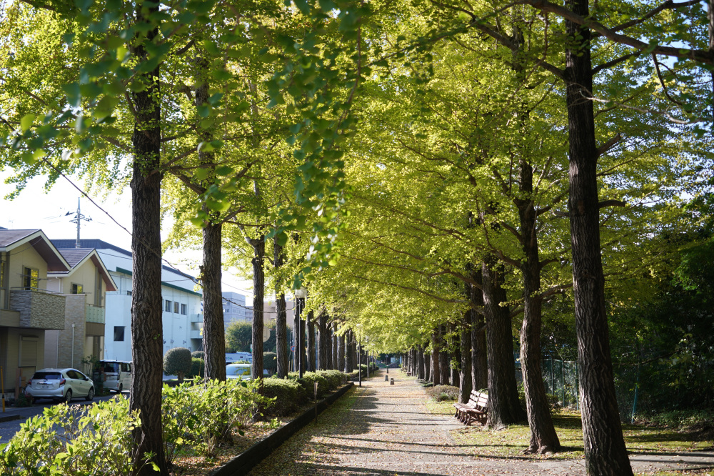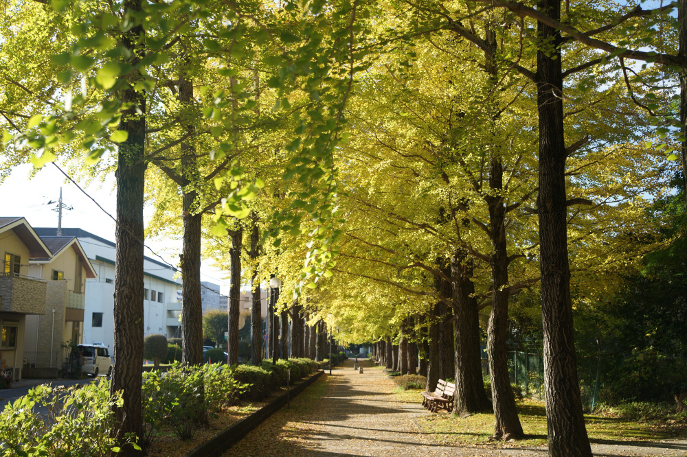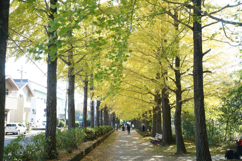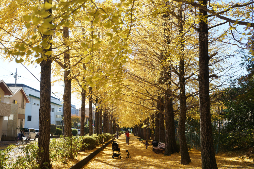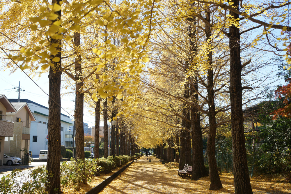 宇都宮駅東公園には、約60本のイチョウが植えられており、紅葉の時期には約170メートル続く黄色いトンネルの中を散歩できます。園内ではモミジの紅葉も見ることもできます。見どころイチョウ並木の紅葉が進むと、並木道の歩道も黄色く輝く絨毯のようになり、絶好のフォトスポットになる。例年、11月上旬から中旬頃にかけてが、紅葉の見頃の時期となり、遊具など遊び場も充実しているので、カップルだけでなくお子様連れにもおススメです。