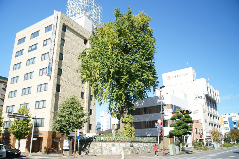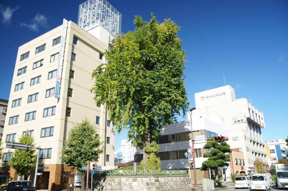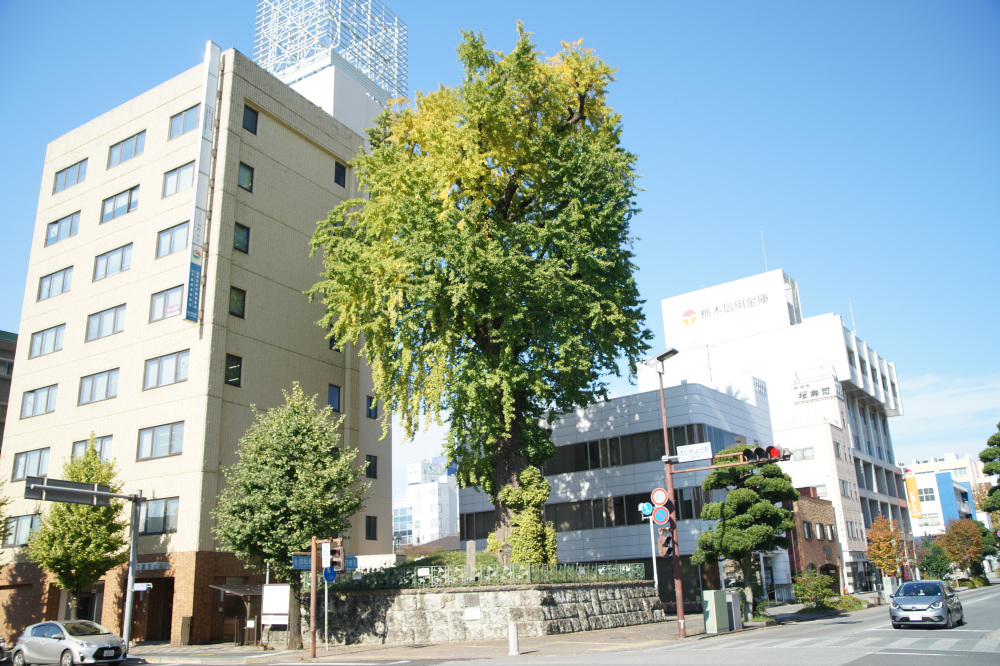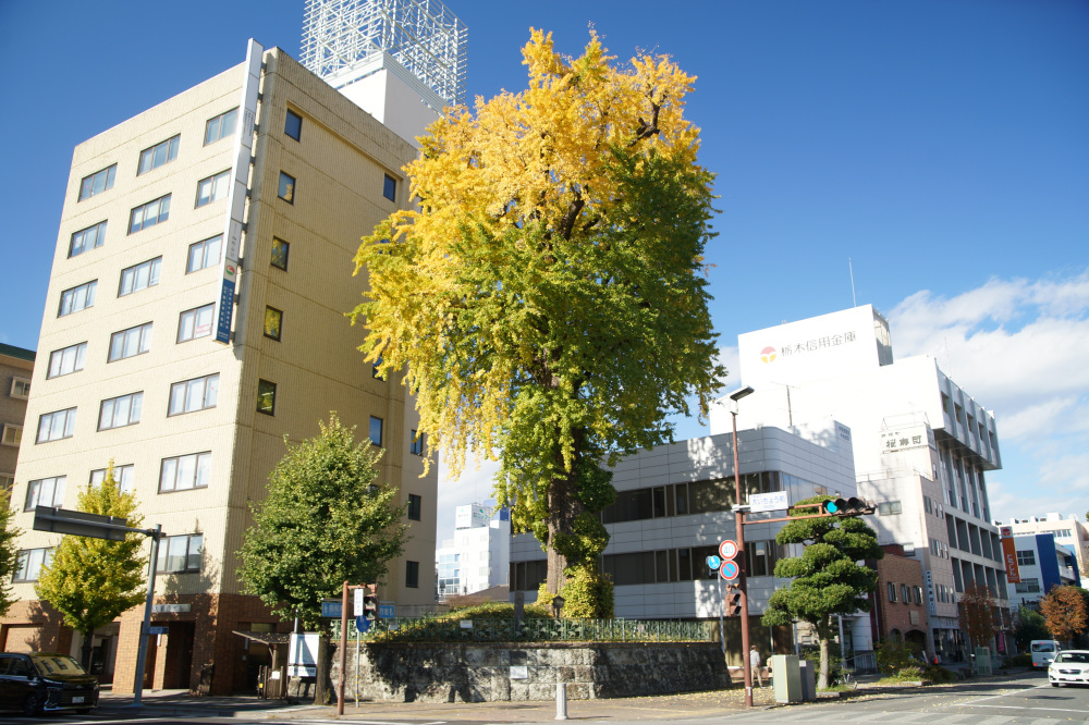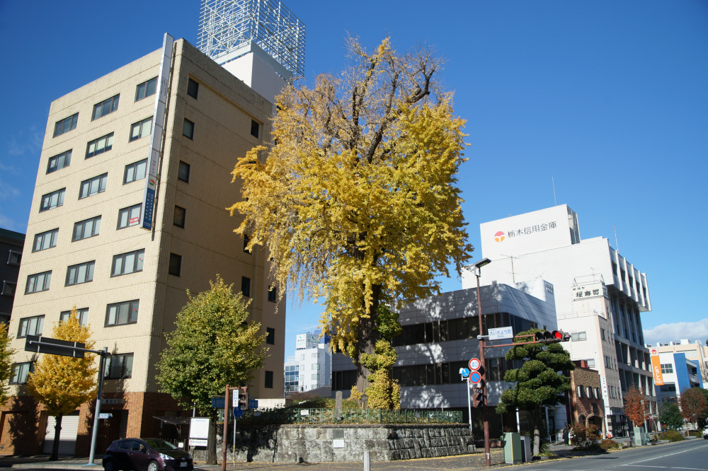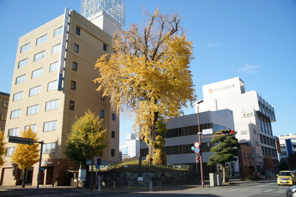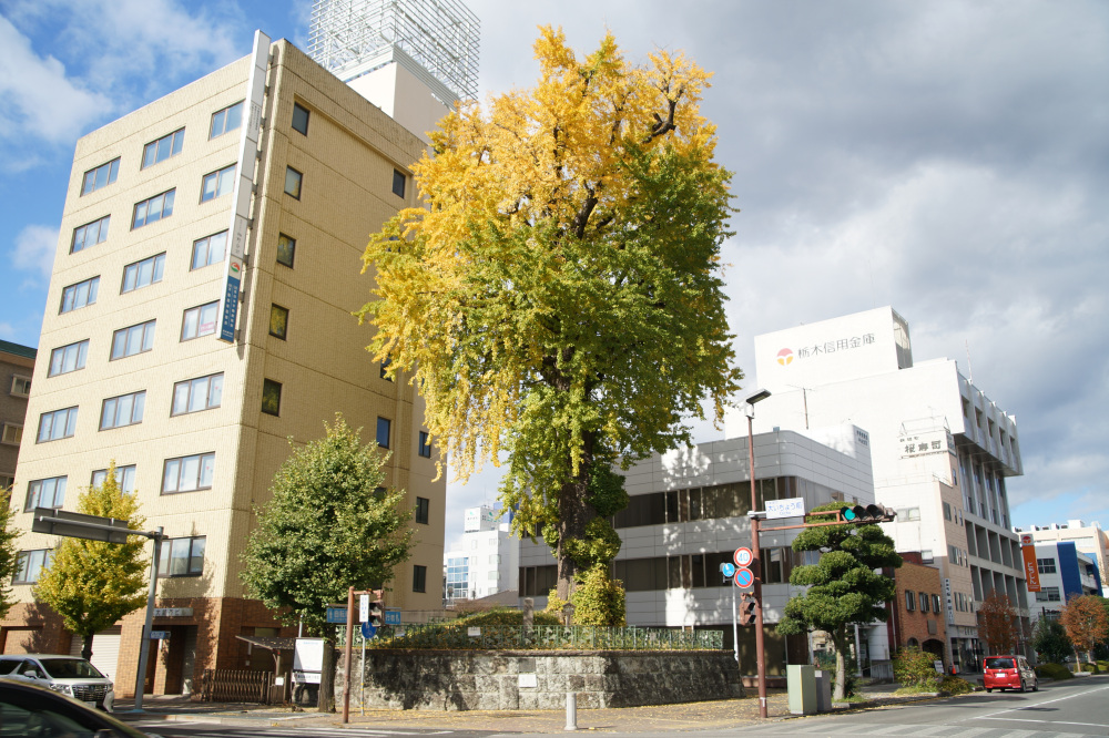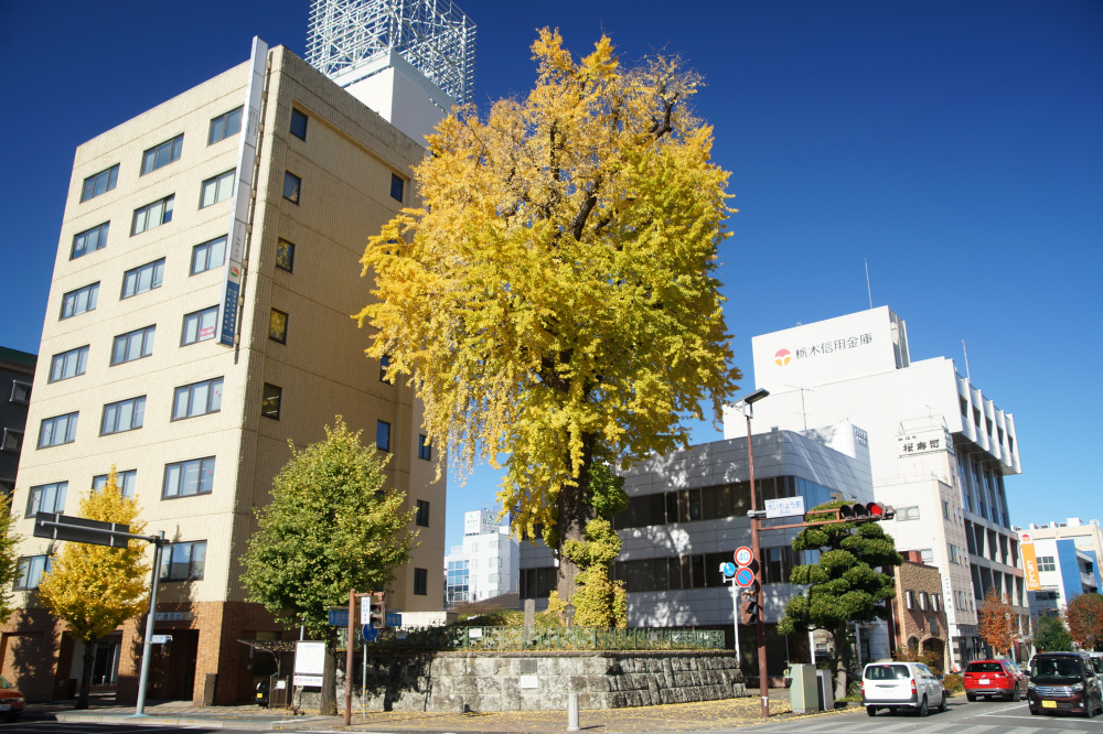 樹木の年齢である樹齢は400年以上と推測され、宇都宮城があった頃から存在していたようです。第二次世界大戦のときには空襲で黒こげになりましたが、次の年には芽吹いたと伝わり、宇都宮のシンボルになっています。この大いちょうは、市の天然記念物にも指定されています。宇都宮市民に愛着・親しみ・誇を感じさせる魅力的な風景として、「うつのみや百景」や「まちなみ景観賞」にも選ばれています。例年の見頃は11月中旬頃です。