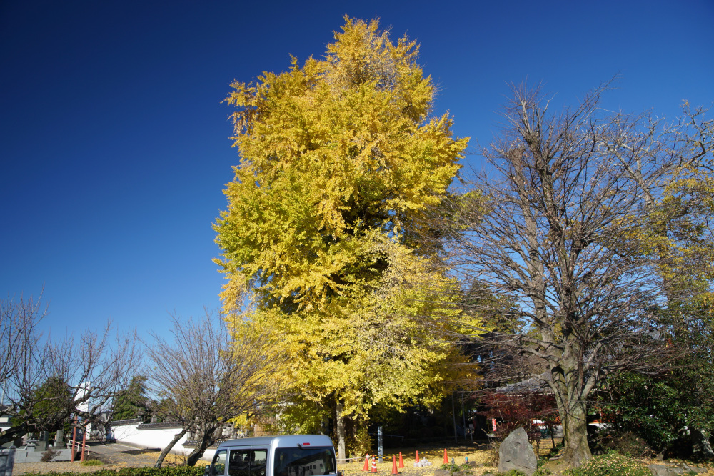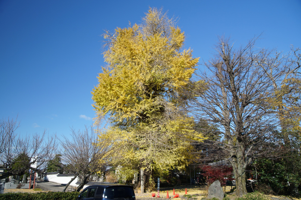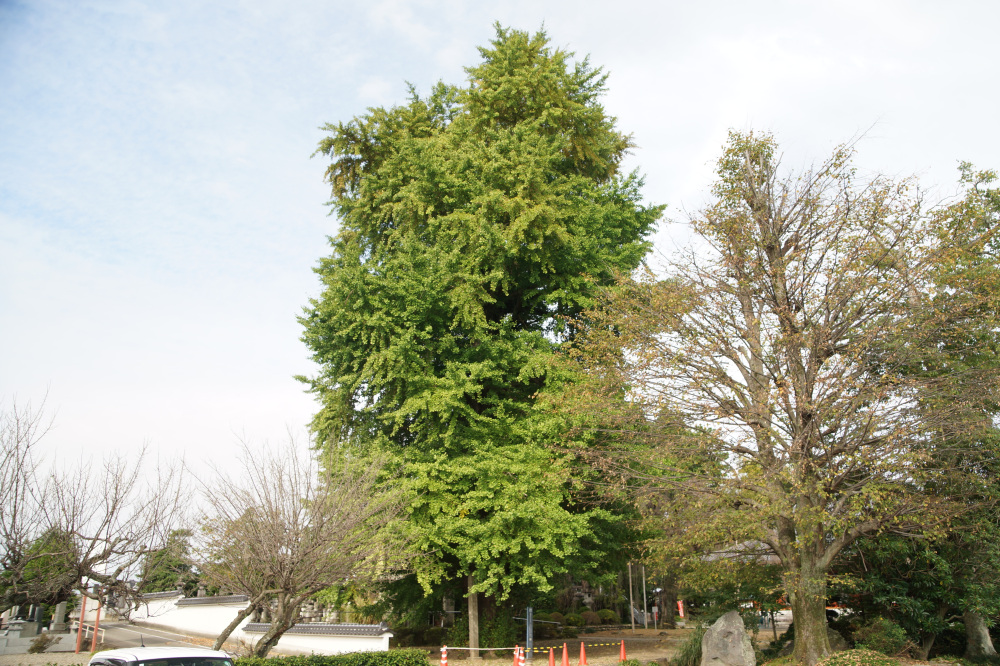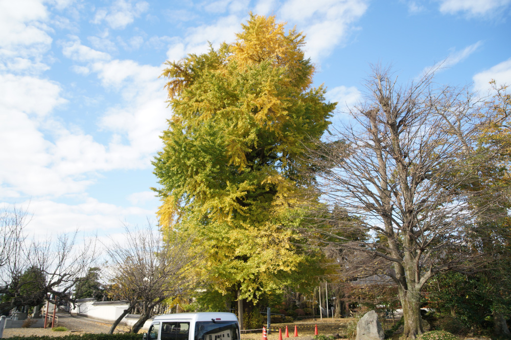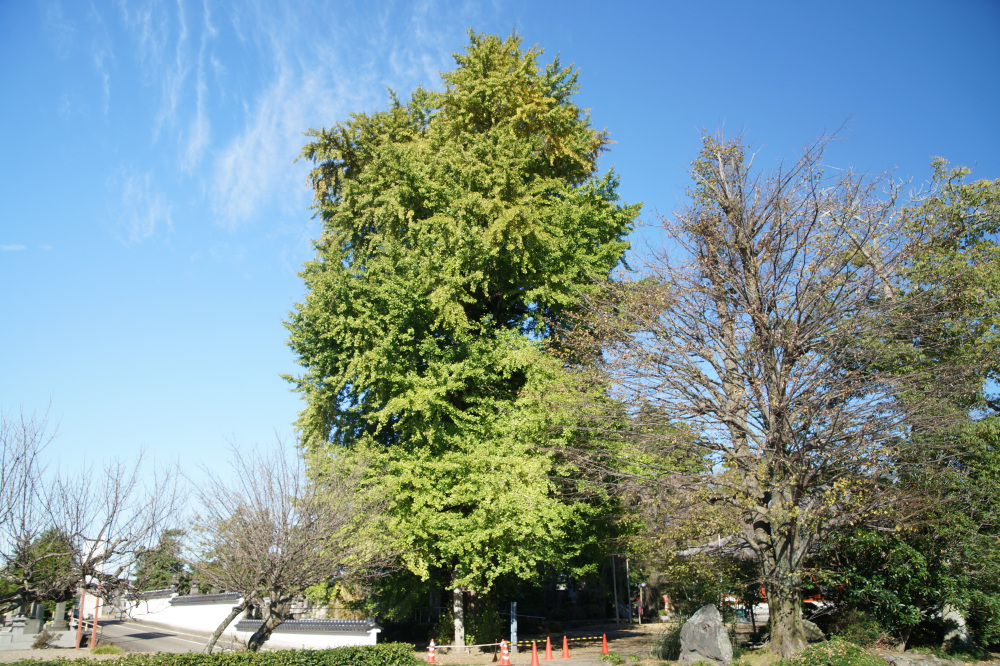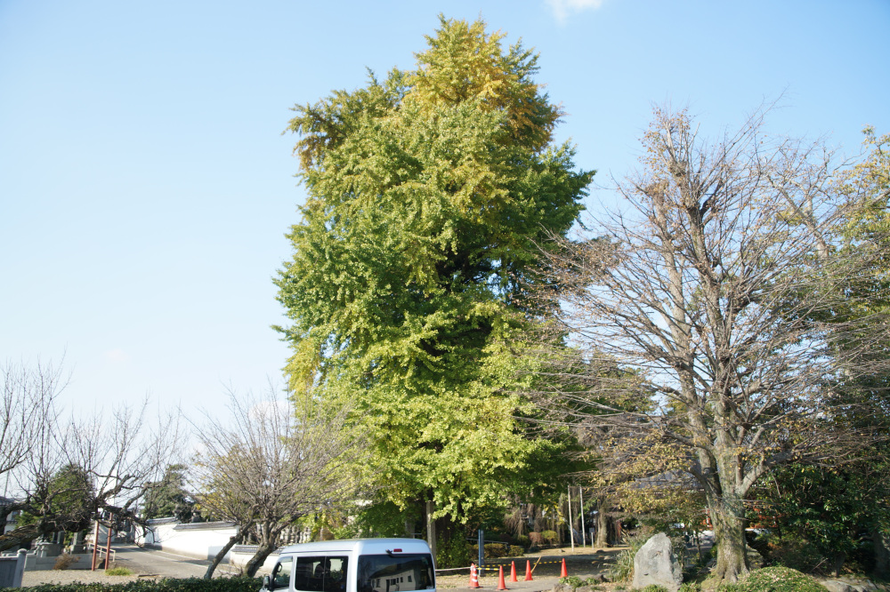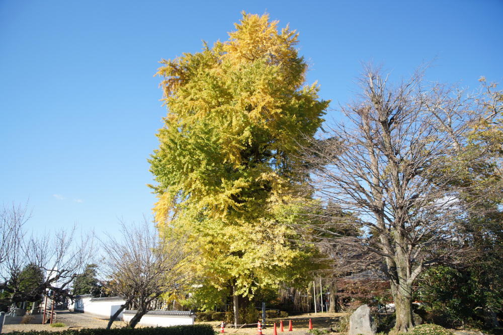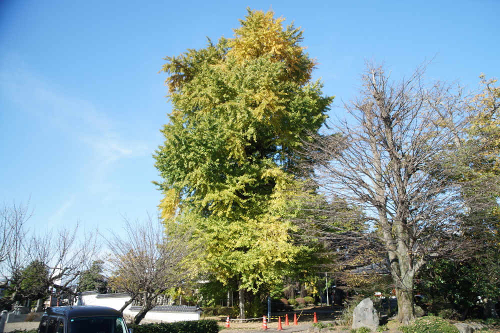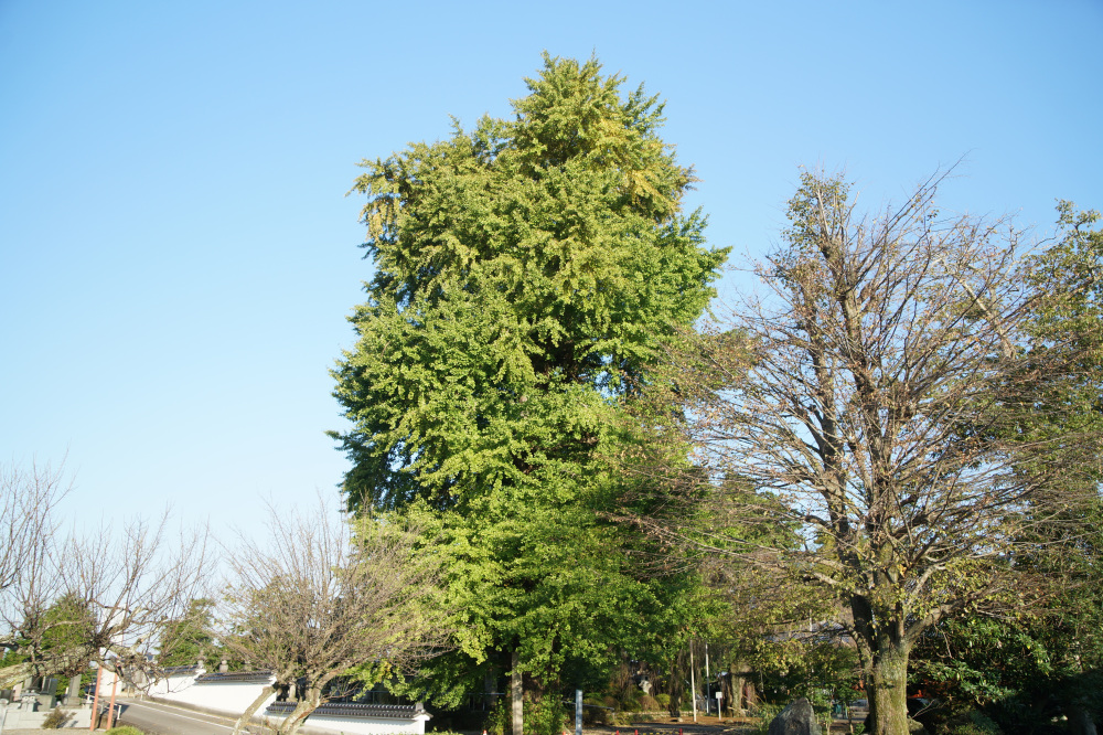 樹高30mに及ぶ巨木で、老木でもあるため乳という大きな気根がたくさん垂れ下がっています。鎌倉時代の武士・安達藤九郎盛長が植えたという伝説も残り、市の天然記念物に指定されています。例年の見頃は11月中旬頃です。
