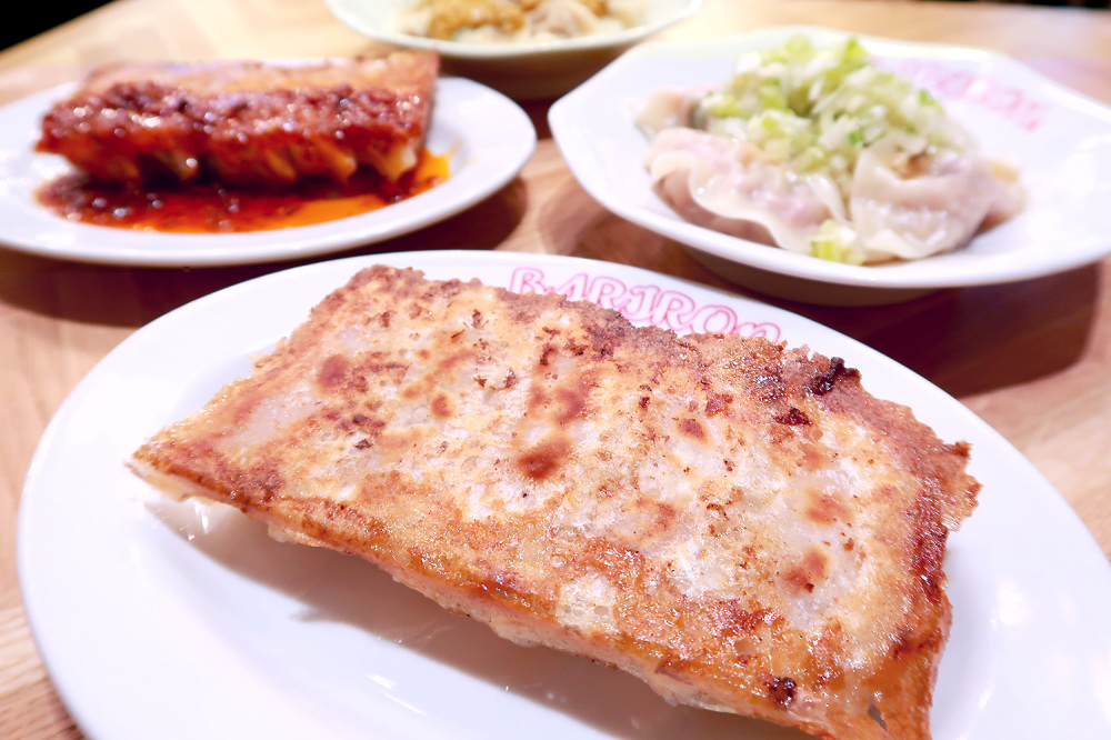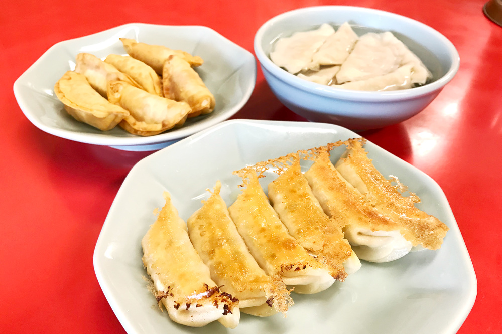 昭和34年創業。もっちりした厚めの皮に包まれた餡は、キャベツをメインにタマネギも入っているので優しい甘味を感じることができます。ゴマ油でしっかりと肉汁を閉じ込めた、パリパリ食感の焼餃子、岩塩でいただく揚餃子も人気。中華だしのスープに入ったプルプルの水餃子はまずはそのまま、次に酢や自家製ラー油を入れて好みにアレンジしていただきましょう。
