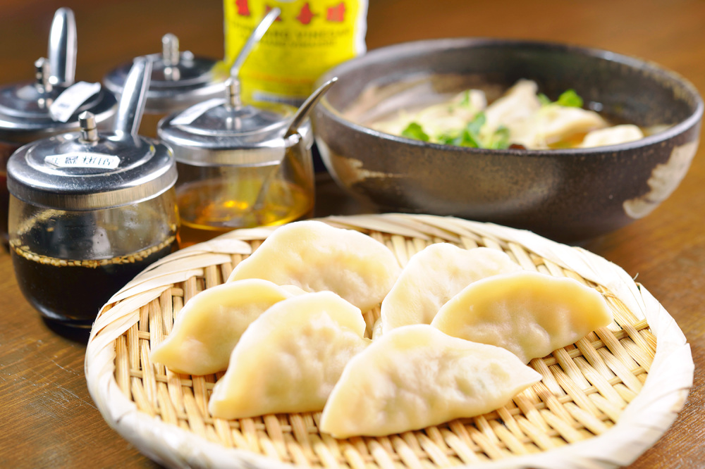 肉汁たっぷり!もちもちの皮のコロンとまるい餃子です。カリっと焼き目のついた焼餃子は、アツアツの肉汁がジュワっと溢れます。一味を入れたマヨネーズを付けていただくのが地元流。またほうれん草を練り込んだ翡翠色の水餃子は、焼餃子とはまた違った食感でこちらも人気です。