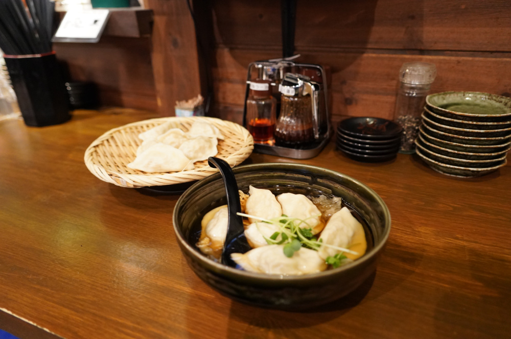 赤い大きな暖簾が目印、古民家風のカフェのようなお店。ジャズが流れる落ち着いた雰囲気のなか、本場中国式の薬膳餃子がいただけます。「薬膳ゆで餃子」は、季節ごとの薬膳スパイスを皮に練り込み、餡はキャベツと豚肉でシンプルに。その分スパイスの風味をしっかり感じる味わいになっています。特製ニンニク醤油タレも癖になる美味しさ。生姜風味のスープでいただく「薬膳スープ餃子」も人気です。