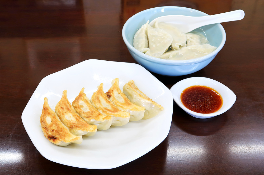 メニューは「焼餃子」「水餃子」の2品のみ。自慢の味を守り続けて50年余の老舗餃子店です。創業当時から丸い鉄なべで焼かれる焼餃子は、皮は薄めでパリパリ、野菜多めでヘルシーです。皮がもちもちの水餃子は、酢や醤油と自家製ラー油で、自分好みの味付けに。持ち帰り用の冷凍餃子も販売しています。