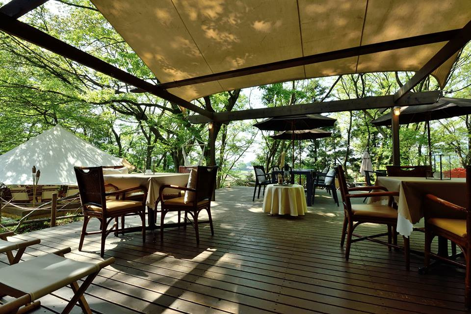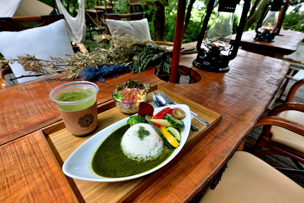 老舗日本茶専門店が営む、森の中のカフェレストラン。グルテンフリーやベジタリアンもOKな“うまべジラーメン”「濃厚担々麺」は昆布や野菜の旨味と胡麻の香り、甘辛な大豆ミートの肉味噌がバランスの良い1杯。旬の地元野菜に有機抹茶ソースがアクセントになっています。自然に中でいただく食事に、心も体も癒されそうです。