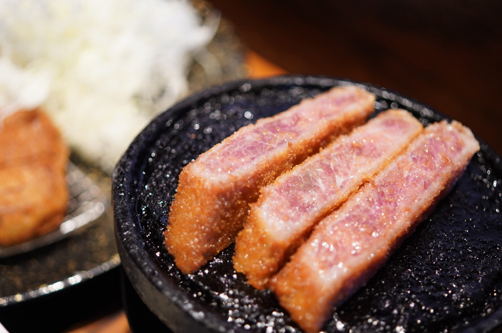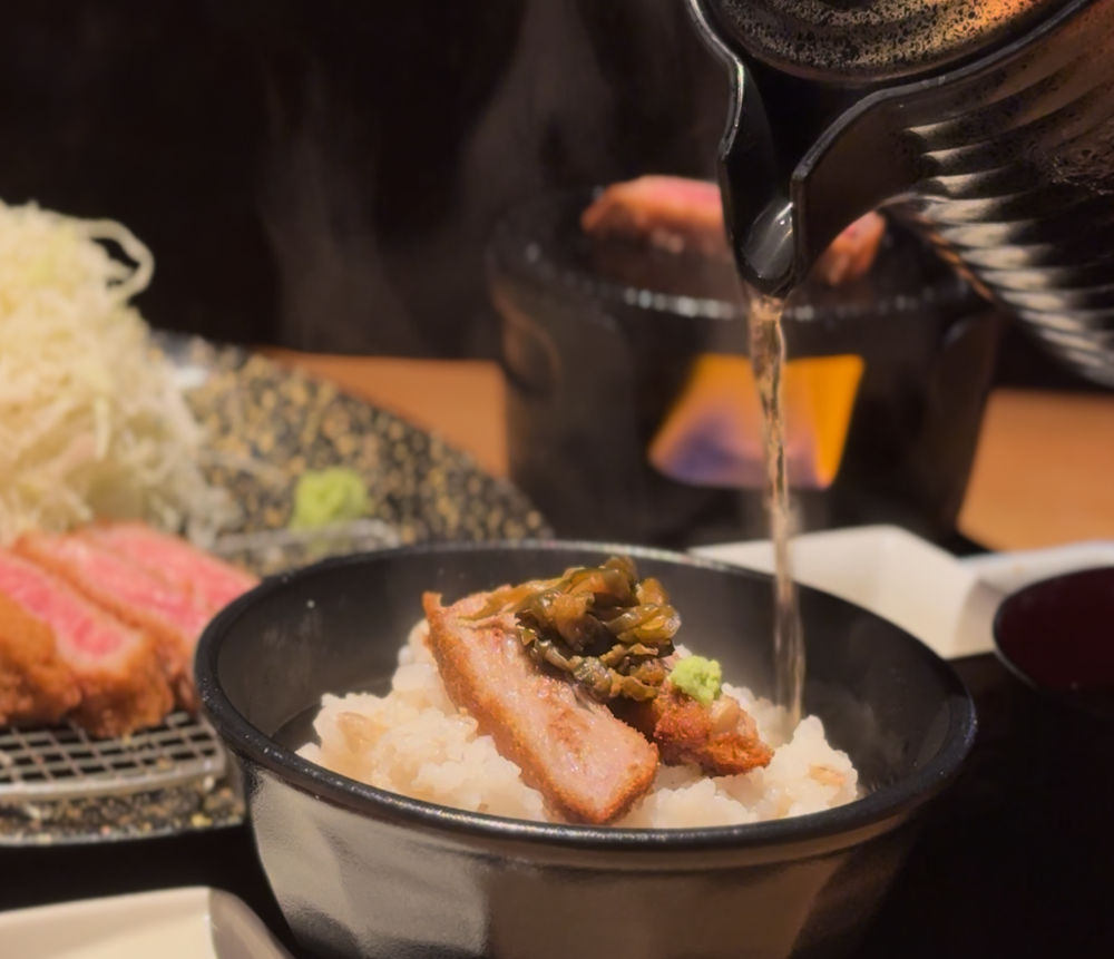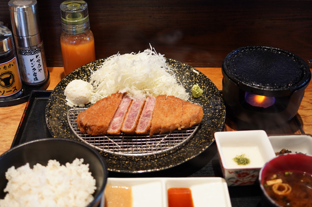 60秒で揚げる牛カツは、まるでサクサクの衣に包まれたサーロインステーキ。外はさっぱり軽やか、中はミディアムレアでしっとりと柔らかく、肉の旨みがしっかりと感じられます。一人用の溶岩プレートでお好みの焼き加減にして、わさび醤油、岩塩、山わさびソースなど、いろいろな味わいで楽しめるのもポイント。出汁とろろも付いて麦飯はおかわりOK。提供も早く、落ち着いた雰囲気でランチが楽しめます。