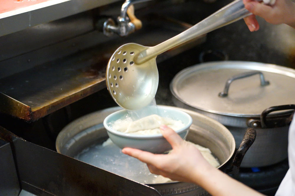 メニューは「焼餃子」「水餃子」の2品のみ。自慢の味を守り続けて50年余の老舗餃子店です。創業当時から丸い鉄なべで焼かれる焼餃子は、皮は薄めでパリパリ、野菜多めでヘルシーです。皮がもちもちの水餃子は、酢や醤油と自家製ラー油で、自分好みの味付けに。持ち帰り用の冷凍餃子も販売しています。