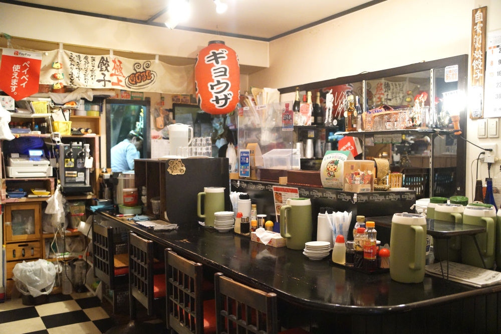 昭和33年創業。現存する餃子専門店の中で最も歴史がある餃子専門店です。ごま油でカリッと表面を焼き上げ、白菜をふんだんに使用した野菜たっぷりの餃子はあっさりジューシー。基本メニューは焼餃子(ヤキ)、揚餃子(アゲ)、水餃子(スイ)のほか、ライスと漬物、飲み物のみ。本店はオープン当初から変わらない天井など、雰囲気も抜群です。