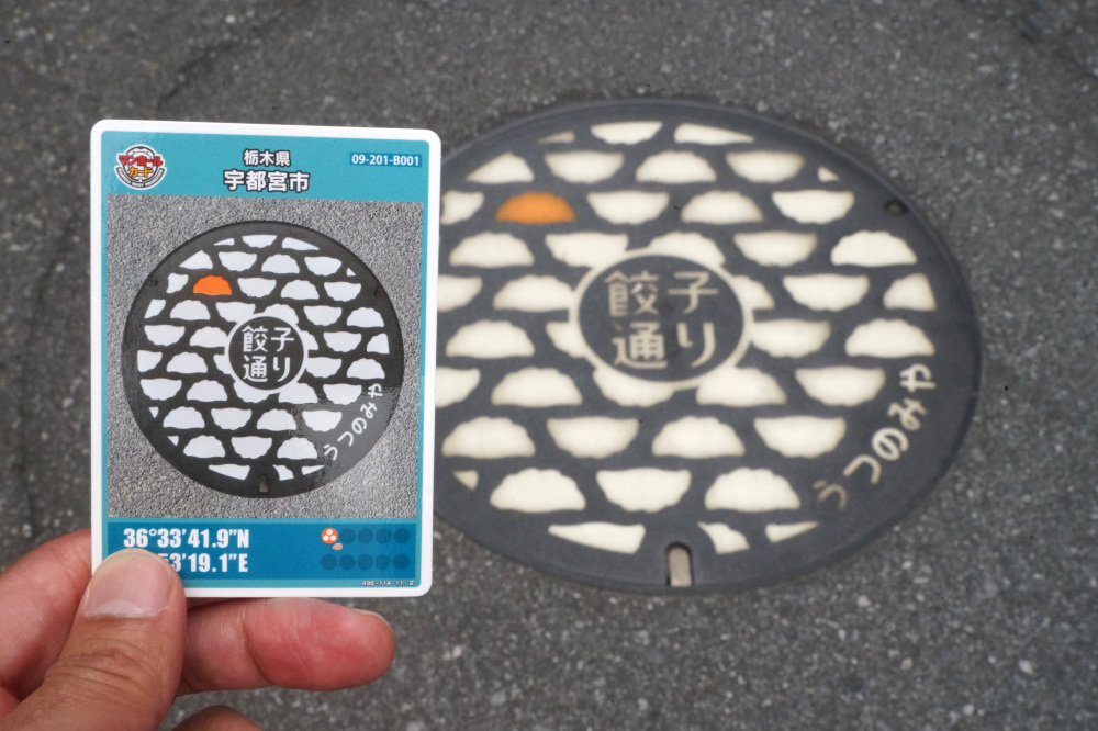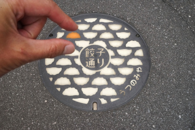 餃子通りには、餃子がモチーフとしてデザインされたマンホール蓋があります。マンホールカードと一緒に写真を撮るのがトレンドのようです(車が通りますので、撮影時はご注意下さい)。