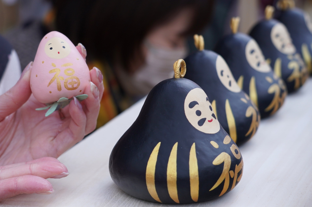 「かんぴょうだるま」は赤(家内安全)だけでなく、白(目標達成)や緑(健康祈願)、黒(商売繁盛)、黄色(金運上昇)、ピンク(良縁成就)のほか、金色の用意もあるようです。「いちごだるま」は赤、白、ピンクの3色が並んでいました。