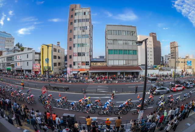 青空、ビルが並ぶ街並み、そして集まったたくさんの人たち・・・。疾走する選手を中心に、高い位置からその賑わいを降格で見事にとらえました。クリテリウムの様子が一目で伝わってくる作品です。