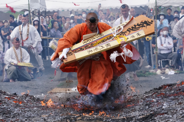 多気山の火渡り式。大きな護摩札を持つ行者が火を渡る迫力のダイナミックさをうまく表現できている作品だと思います。世界平和を願う気持ちがうまく伝わっている作品だと思います。