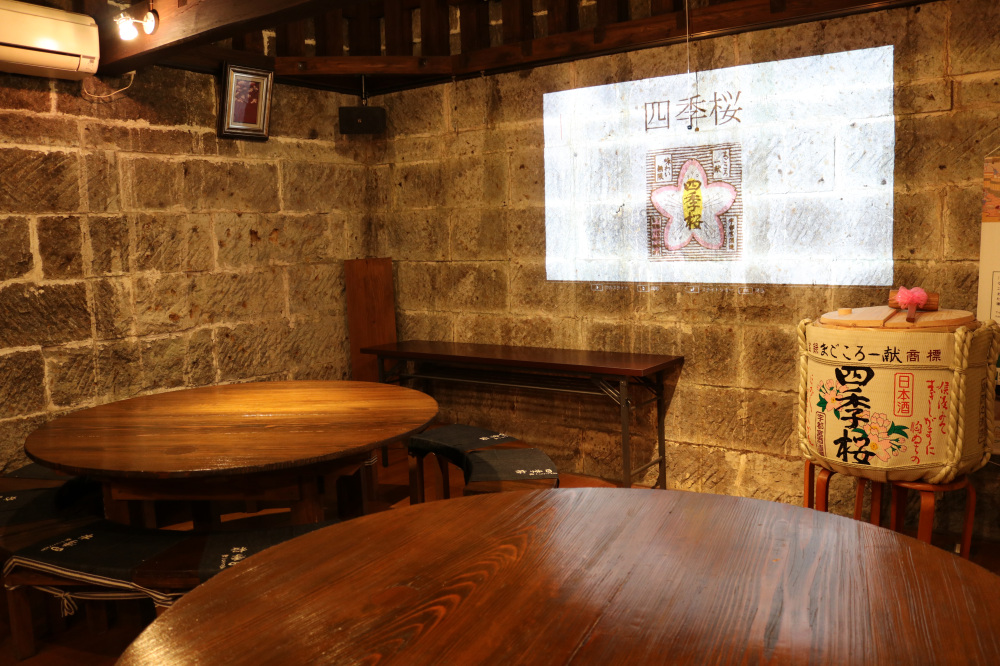 最初にコインを購入して日本酒サーバーや店内の料理を注文する、気軽な立ち飲みバー。大谷石を使った大きなメインテーブルを囲めば会話も弾みそうです。