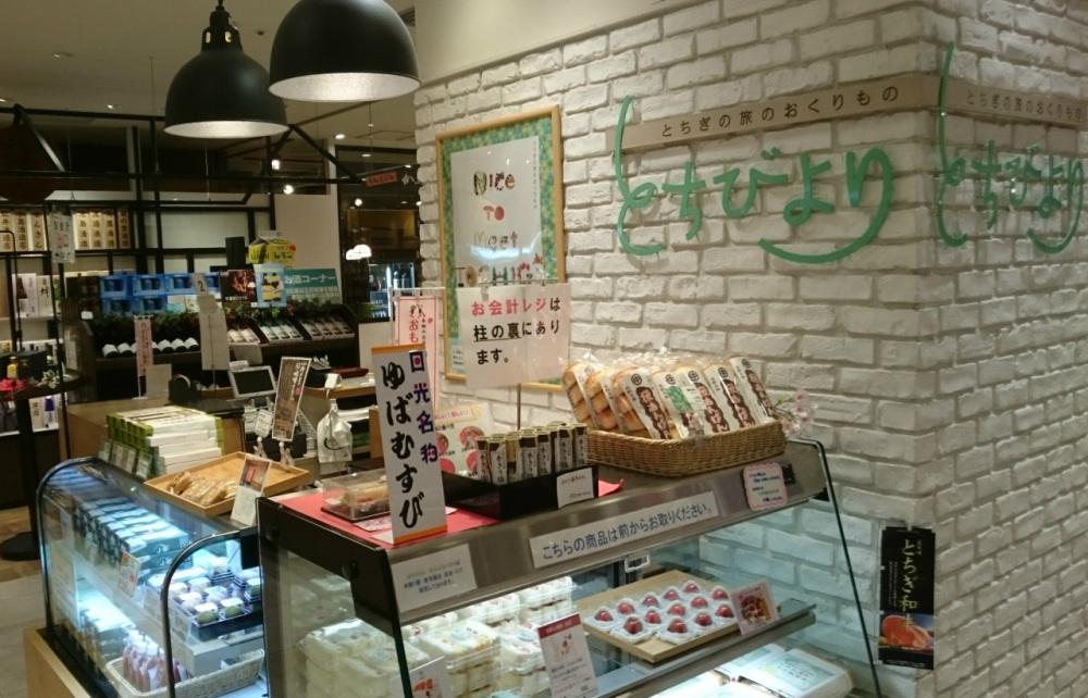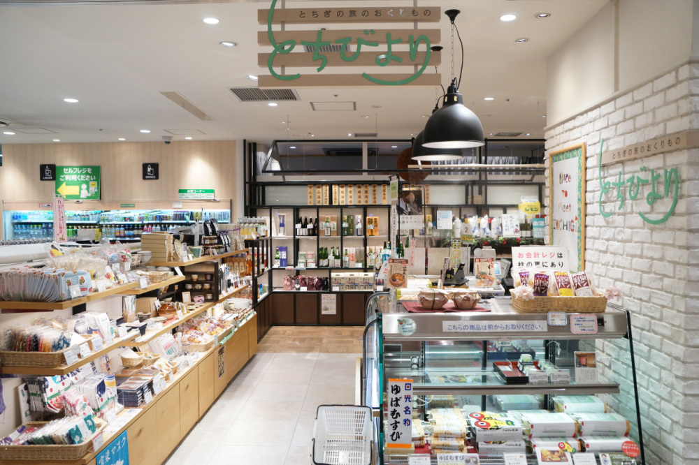 JR宇都宮駅ビルパセオの「とちぎグランマルシェ」内にある「とちびより」には、県内産の銘品がずらり。もちろん地酒の品揃えも豊富です。市内3つの酒蔵の純米酒を飲み比べできるセット「酒蔵散歩」はお土産にもおすすめ。