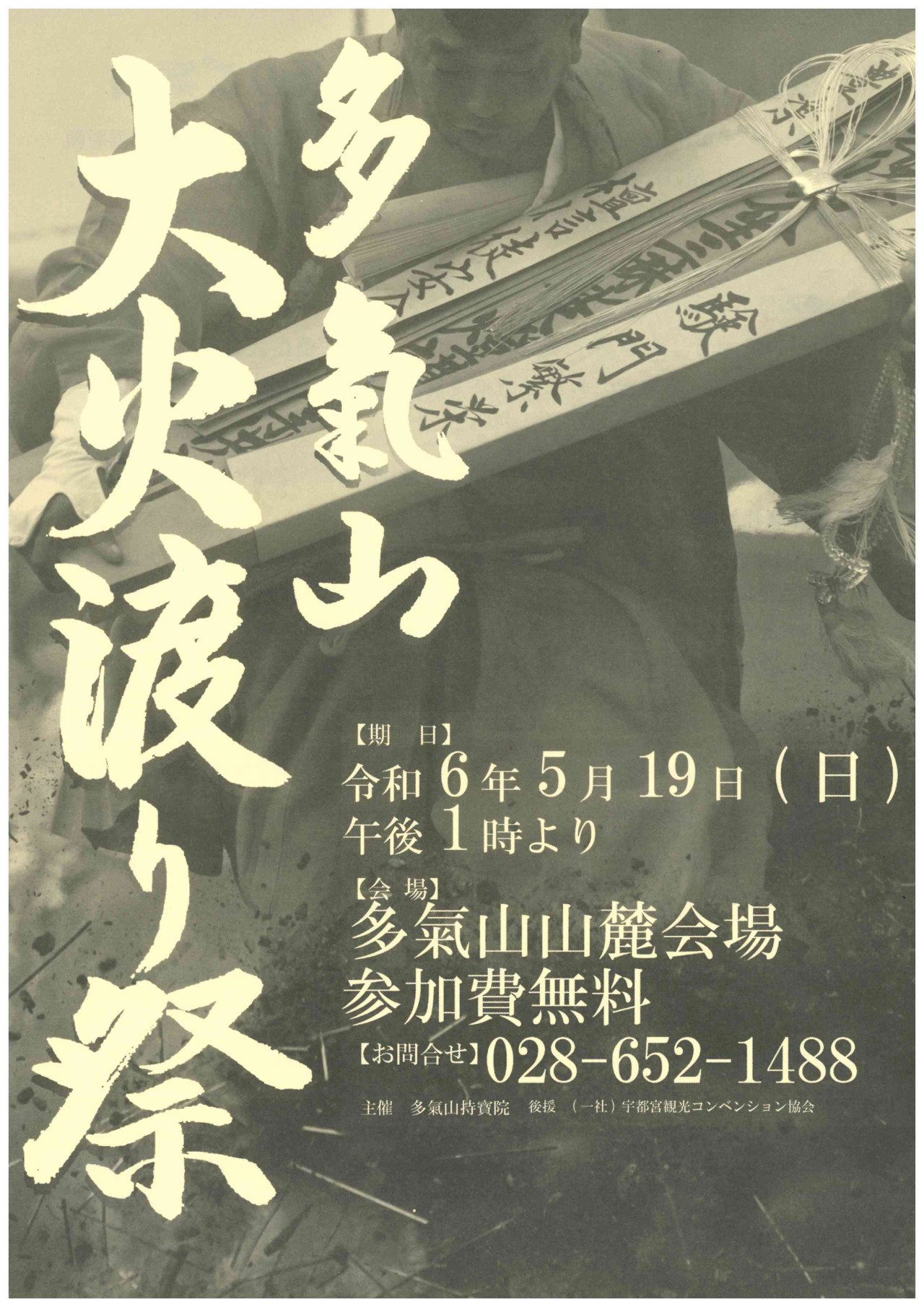 「多氣山大火渡り祭」開催のお知らせ 2024-04-19 お知らせ 2024年5月19日(日)多氣山不動尊にて「多氣山大火渡り祭」が行われます。多くの山伏たちが皆様の除災開運・無病息災を祈願する柴燈護摩供(さいとうごまく)を執り行います。その後、一般の方々も火渡りの御修行に無料で参加でき、肌守が授与されますのでお出かけ下さい。 関連リンク 詳しく見る