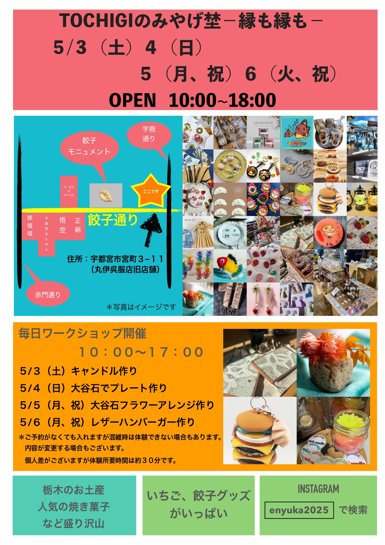 「餃子通り」が一年で1番賑わうゴールデンウェーク(2025年5月3日(土)~6日(火・祝))の4日間、丸伊呉服店旧店舗において、栃木の企業、クリエーターによるPOP UP SHOP がオープンします。お菓子、Tシャツをメインにここでしか手に入らない商品を販売。他に栃木の銘菓、珈琲の試食試飲、ワークショップの開催など盛りだくさんのイベントをお楽しみいただけます。