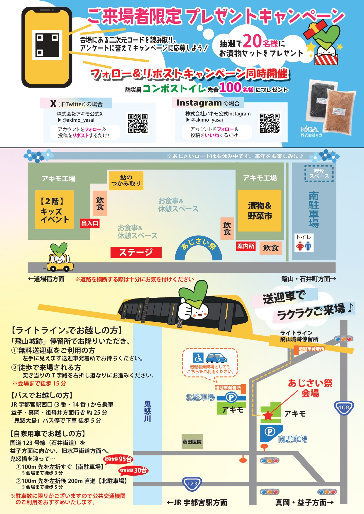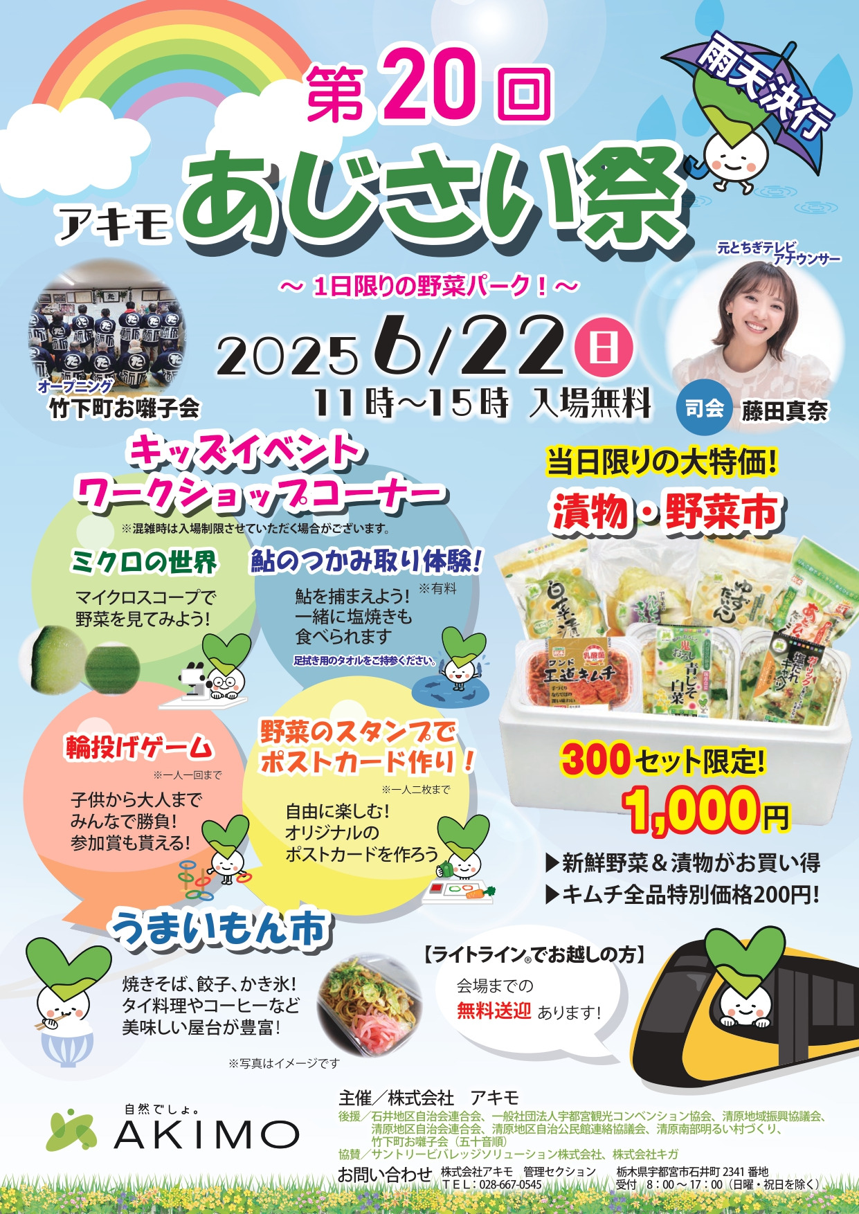 1日限りの野菜パーク!「第20回アキモあじさい祭」のお知らせ 2025-05-26 イベント 2025年6月22日(日)アキモ敷地内で「第20回アキモあじさい祭」が開催されます。お漬物を使った「うまいもん市」、当日限り大特価の「漬物・野菜市」など会場内では催し物がたくさん。ライトラインでお越しの方には、会場までの無料送迎がありますので、是非お出かけ下さい。 関連リンク 詳しく見る
