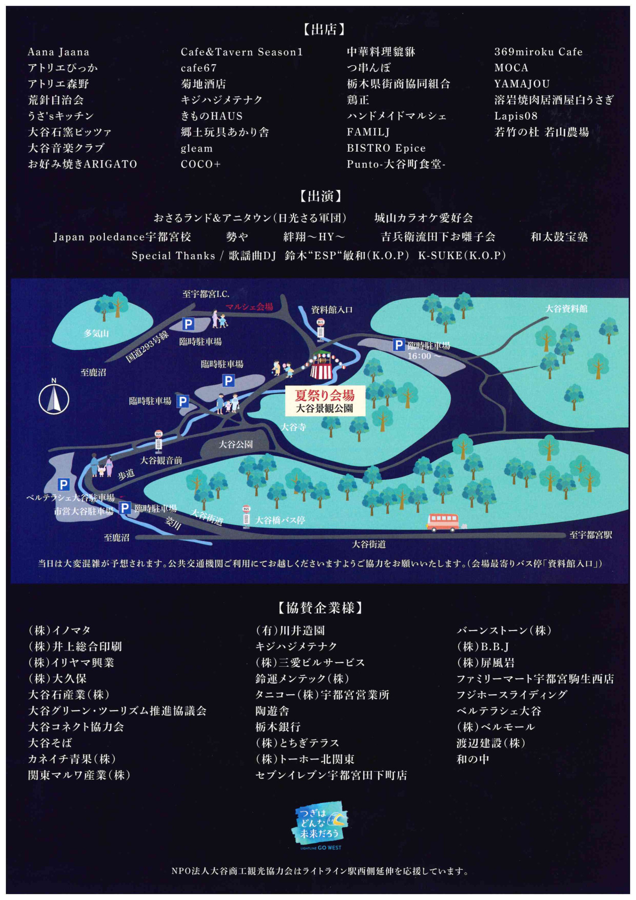 近年復活した大谷夏祭りが、今年はさらにパワーアップ!県内の人気店やキッチンカーが大谷の夏祭りを盛り上げます。オリジナルTシャツ作り、夏らしさ満点の風鈴絵付けにはりこの絵付け、竹の水鉄砲等、楽しいワークショップも。