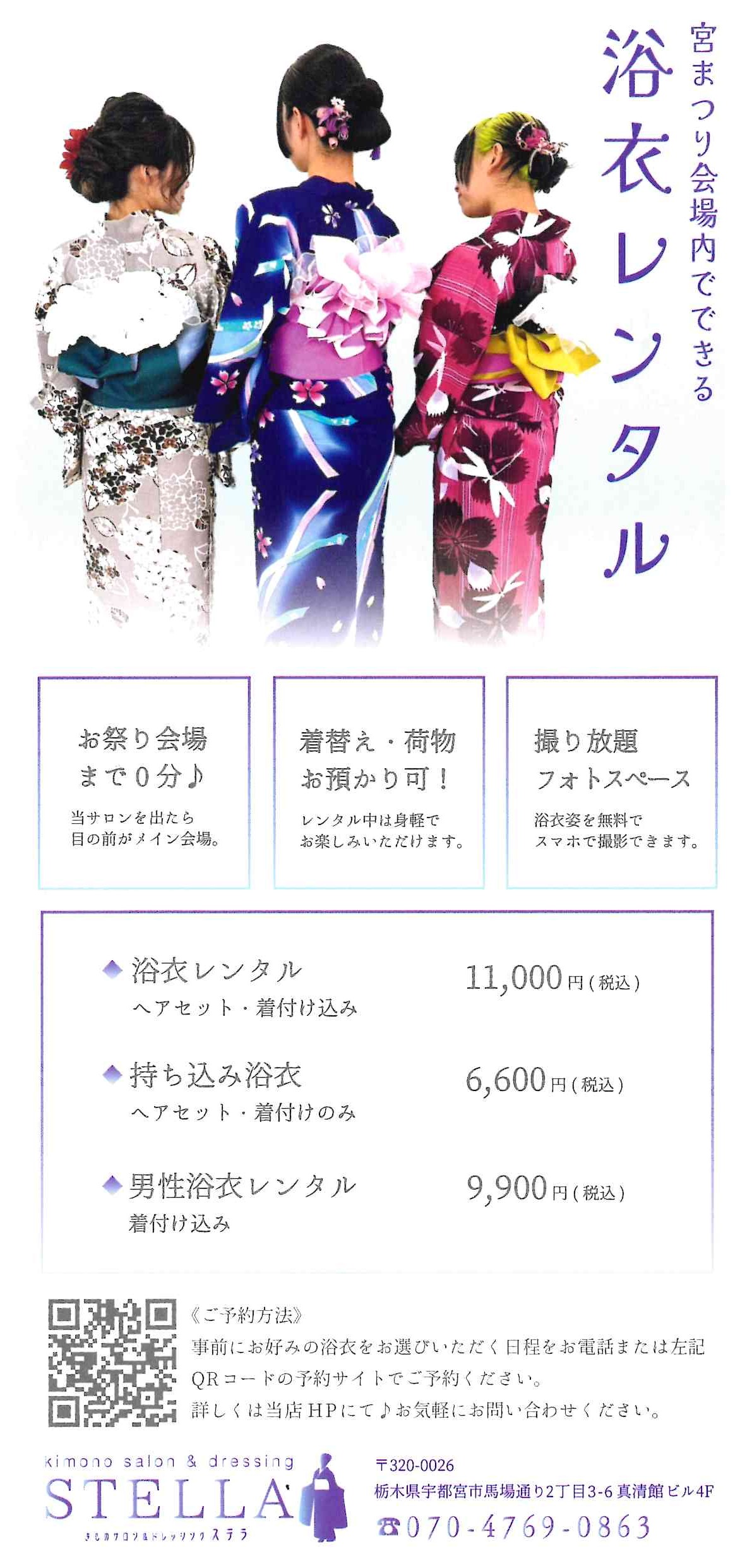着物をはじめとした日本の伝統文化を体験できる“Kimono salon& dressing STELLA” では、宮まつり会場内でできる特別な「浴衣レンタルプラン」をつくりました。サロンを出たら目の前がメイン会場なので、お祭り会場まで0分!着替えや荷物も預けられるので身軽なままお祭りを楽しめます。浴衣の貸出(持ち込みもOK)とヘアセット・着付け込みのとてもお得なプランになっています。ぜひ今年の宮まつりは浴衣を着て楽しんでみてはいかがでしょうか。