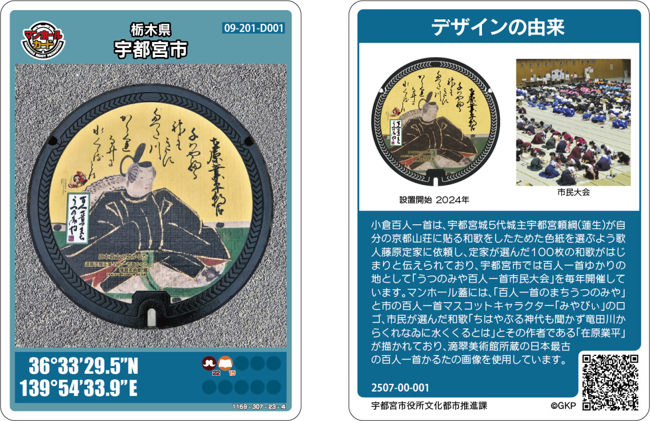 「百人一首と和歌の都」である宇都宮市では、宇都宮と深い関わりのある「小倉百人一首」を通して、短詩型文学の普及・振興を図るため、令和7年7月25日(金)から「百人一首マンホールカード」の配布を開始しました。
