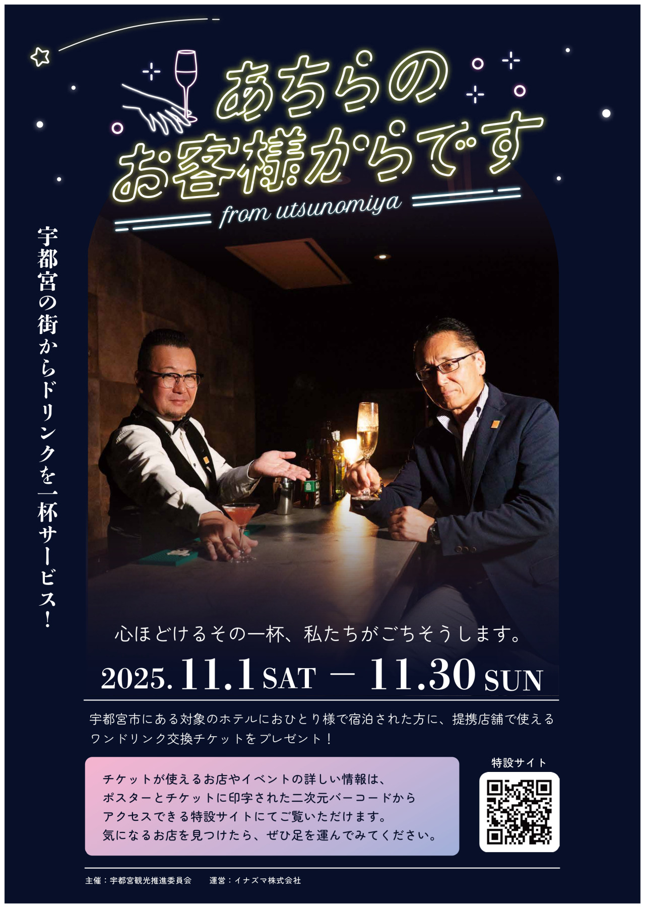 「あちらのお客様からです」開催中! 2025-11-02 イベント 2025年11月1日(土)から30日(日)にかけて、宇都宮の街からドリンクを1杯サービス!宇都宮市にある対象のホテルにおひとり様で宿泊された方に、提携店舗で使えるワンドリンク交換チケットをプレゼント!心ほどけるその一杯、私たちがごちそうします!チケットが使えるお店やイベントの詳しい情報はホームページでご覧ください。 関連リンク 詳しく見る