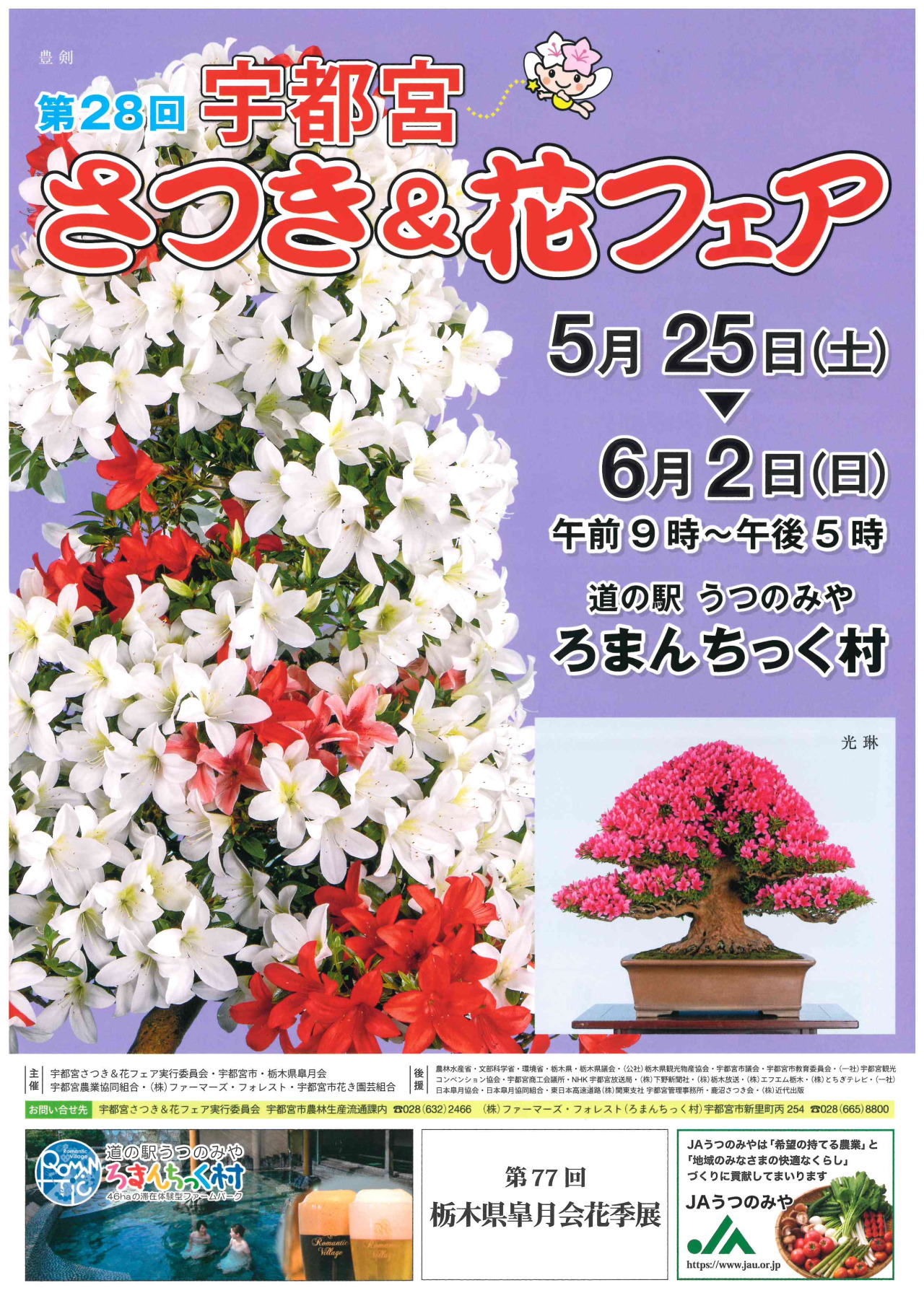 「第28回 宇都宮さつき&花フェア」開催のお知らせ 2024-05-08 イベント 「宇都宮さつき&花フェア」では、内閣総理大臣賞をはじめ全国各地の愛好家が丹精込めて育てた「さつき」約200点が展示されます。また、“さつき”をはじめ、数多くの花き・花木の即売が行われます。宇都宮市の花(市花)になっている“さつき”を見に、ぜひおでかけください。 関連リンク 詳しく見る