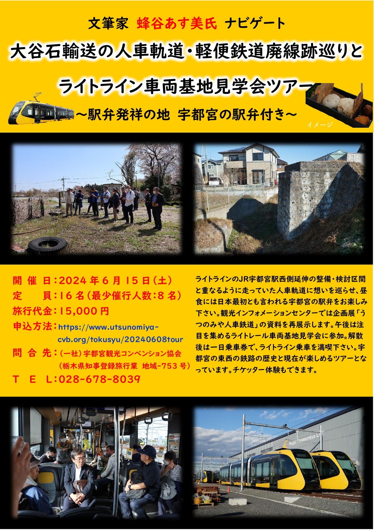 一般社団法人宇都宮観光コンベンション協会は、3月に募集を行い、翌日には満席となるなど、大好評をいただいた「大谷石輸送の人車軌道・軽便鉄道廃線跡巡りとライトライン車両基地見学会ツアー」の2回目の募集を5月20日(月)10:00に開始します。今回は文筆家蜂谷あす美氏をナビゲーターに招聘します。