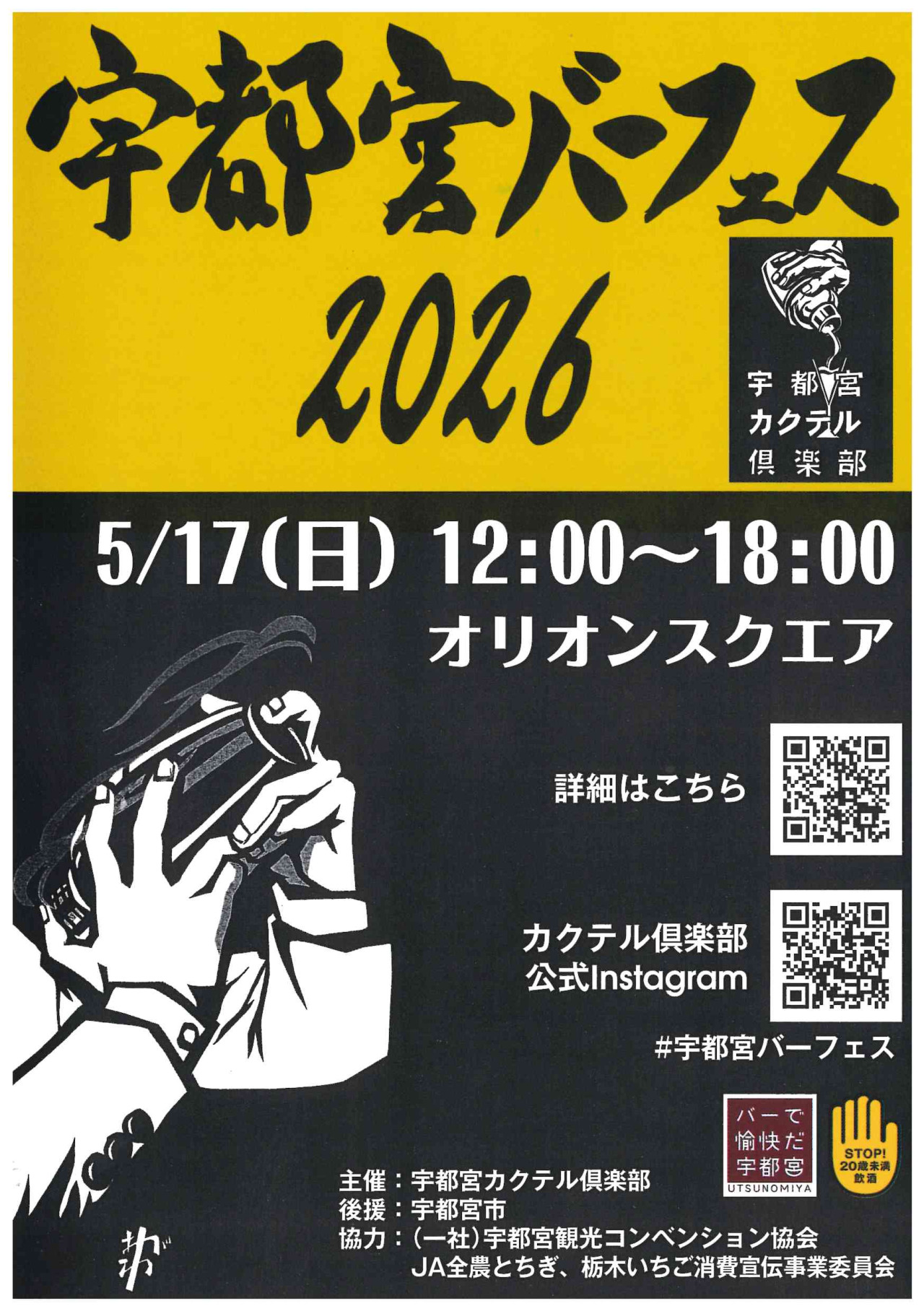 2026年5月17日(日)に屋外カクテルイベント「宇都宮バーフェス2026」が開催されます。今年のテーマは『栃木県の魅力をカクテルで発信』です。とちあいかを使ったカクテルをはじめ、宇都宮や栃木をテーマにしたカクテルのほか、モクテル(ノンアルコールカクテル)メニューを充実させ、お酒が苦手な方やお酒を飲まない方、お子様連れの家族など、カクテルに馴染みのない方も楽しめるイベントです。ステージイベントやフードブースも出店されます。普段なかなかバーに行けない方も、宇都宮のバー文化やカクテルをお楽しみください。