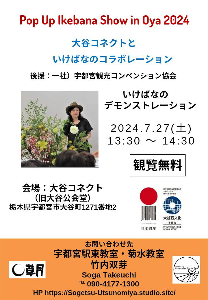 「Pop Up Ikebana Show in Oya 2024」開催のお知らせ 2024-06-25 イベント 大谷コネクトを会場に、竹と大谷石と花を使った、いけばなのデモンストレーションを行います。大谷石といけばなのコラボレーションで「大谷コネクト」を力強く美しく彩りますので、お近くにお越しの際にはぜひご覧ください。