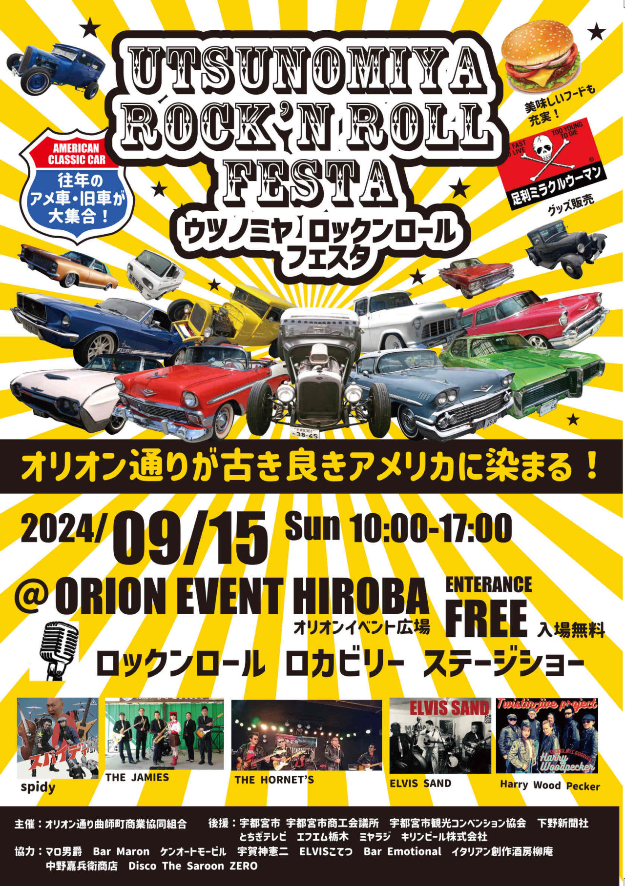 「ウツノミヤロックンロールフェスタ」開催のお知らせ 2024-08-27 イベント オリオンイベント広場で「ウツノミヤロックンロールフェスタ」が昨年に引き続き2024年9月15日(日)開催されます。往年のアメ車が大集合!オリオン通りが古き良きアメリカに染まります。バンドの演奏やフードブースの出店がありますので、是非おでかけ下さい。