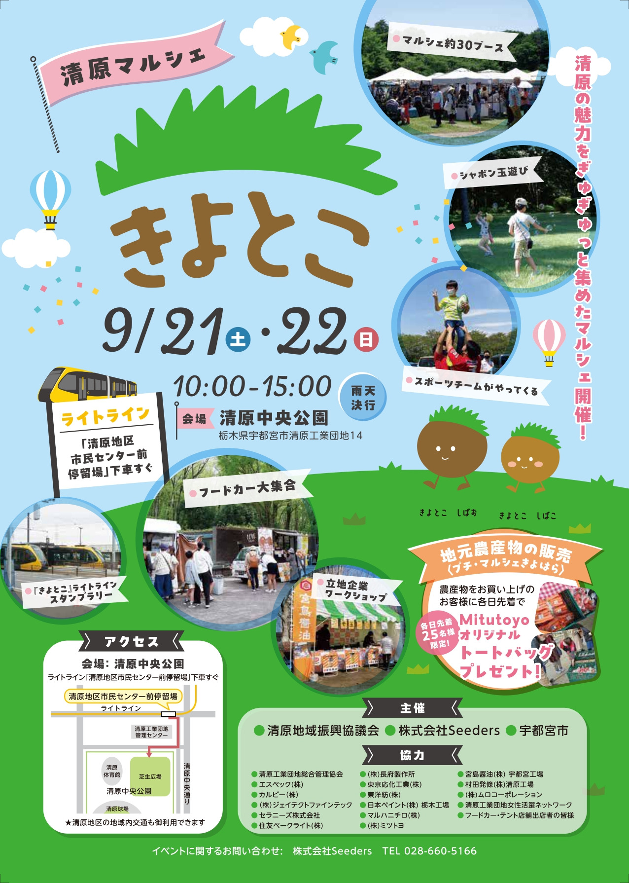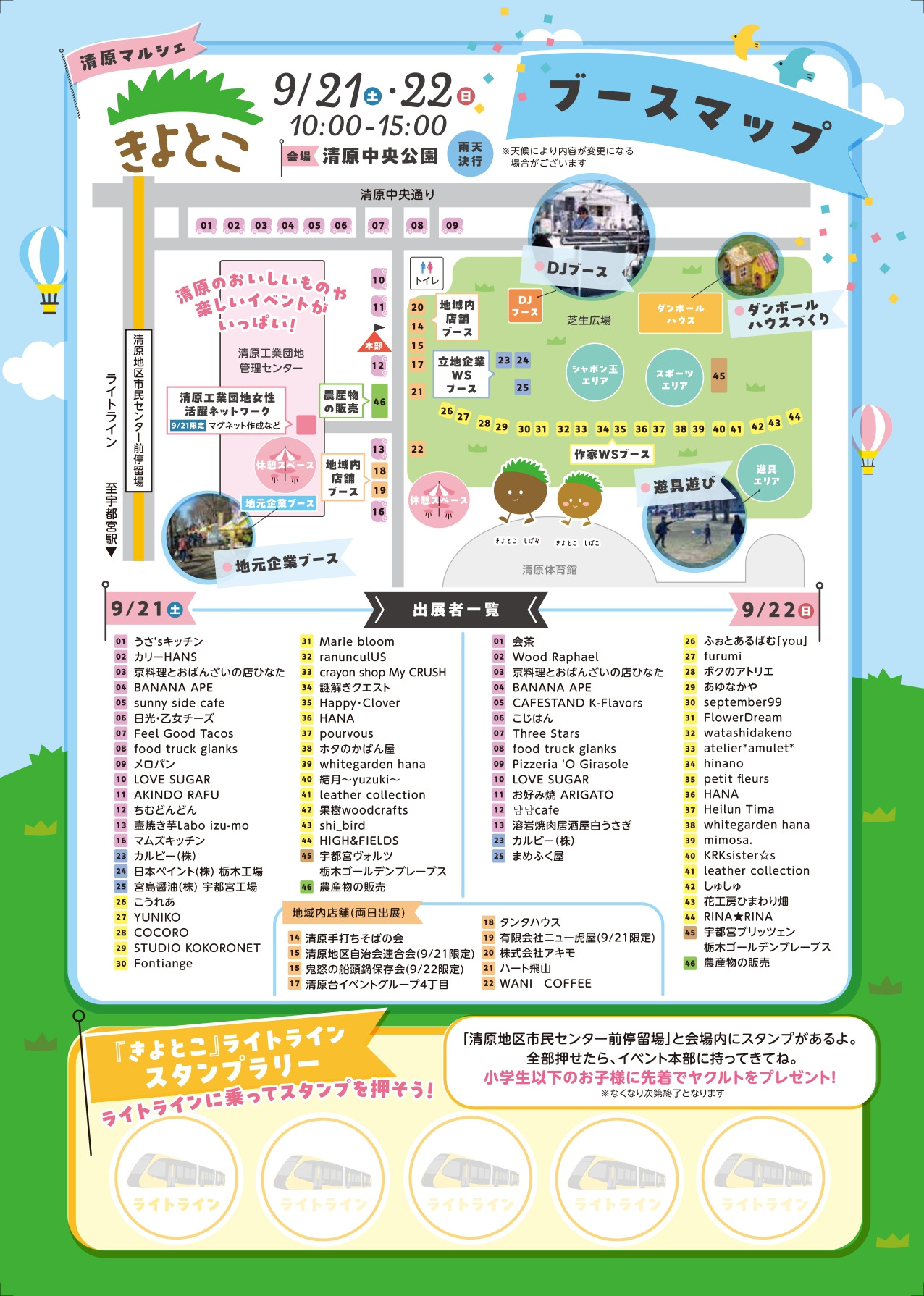 地元農産物の販売をはじめ、約30ブースからなるマルシェやフードカー出店、立地企業によるワークショップ、スタンプラリーなど、清原のおいしいものや楽しいイベントがいっぱい!清原地域の魅力を「見て・触れて・楽しむ」イベントですので、ぜひライトラインに乗ってお出かけください。