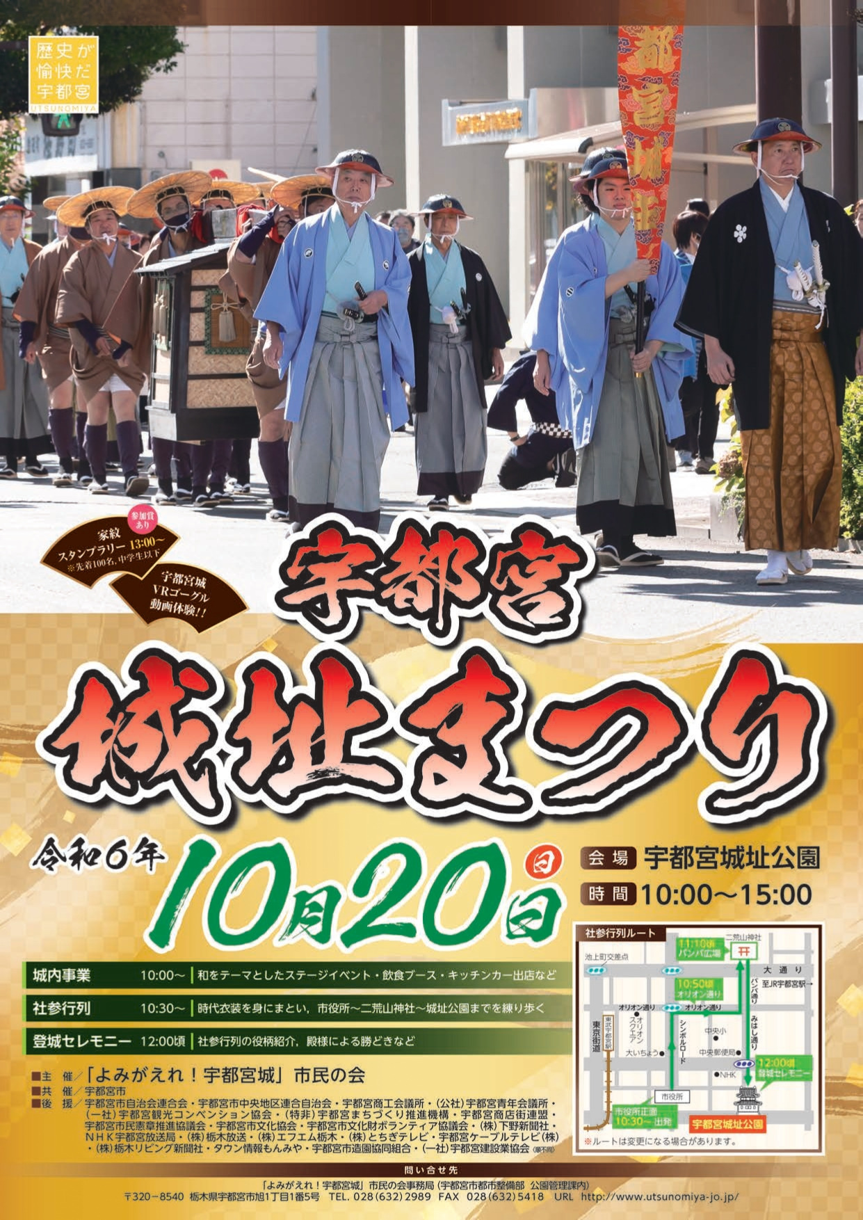 社参行列を見に行こう!「宇都宮城址まつり」開催のお知らせ 2024-10-02 イベント 江戸時代に宇都宮城主の戸田忠恕公が徳川家茂公の代理で日光東照宮を参詣する様子を再現する「社参行列」をメインとした「宇都宮城址まつり」が2024年10月20日(日)開催されます。他にも「和」をテーマとしたステージイベント、飲食・販売・体験ブースの出店などイベントが目白押し!ぜひお出かけ下さい。 関連リンク 詳しく見る